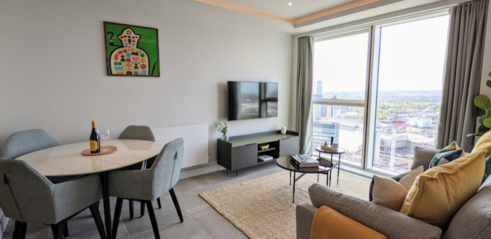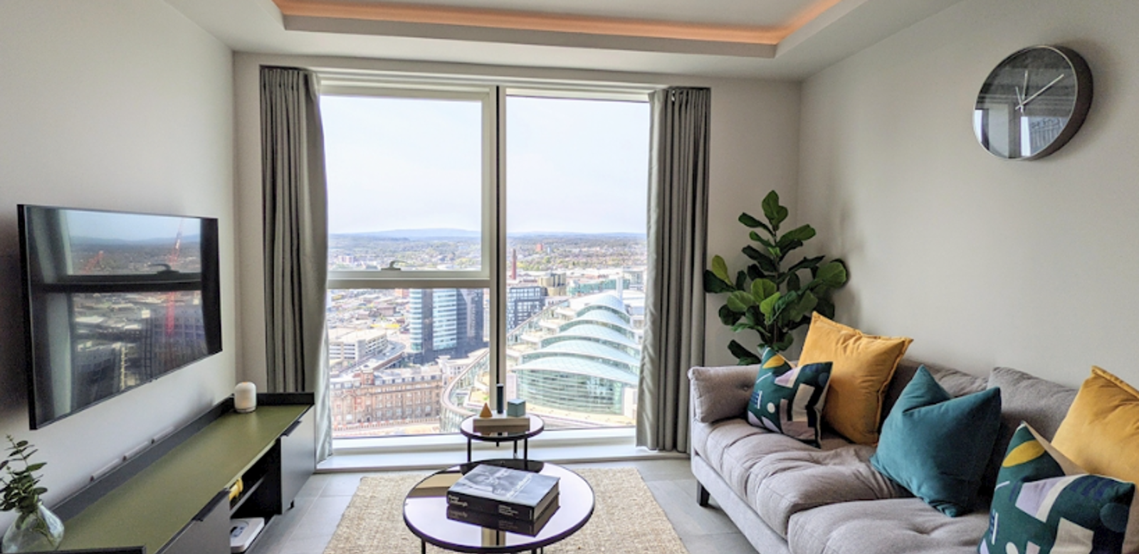 Floor to ceiling windows and curtains, 3-seater velvet sofa and lounge chair, media storage unit with a 50" inch Samsung 4K smart TV and high gloss, nested coffee tables.