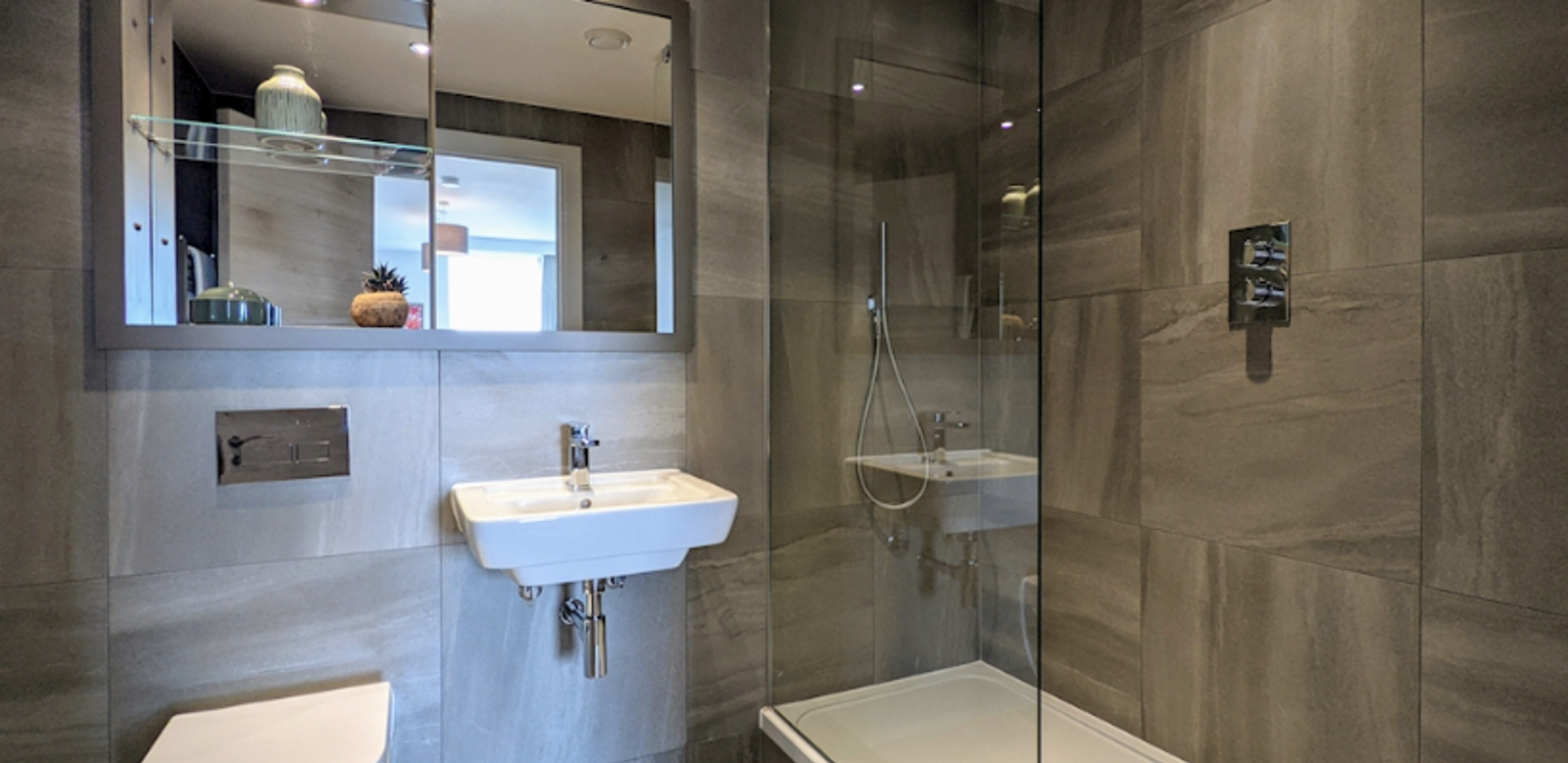 Rainfall shower with separate handheld shower, WC and heated towel rail, plus vanity cabinet with LED lighting. Separate baths available in selected apartments.
