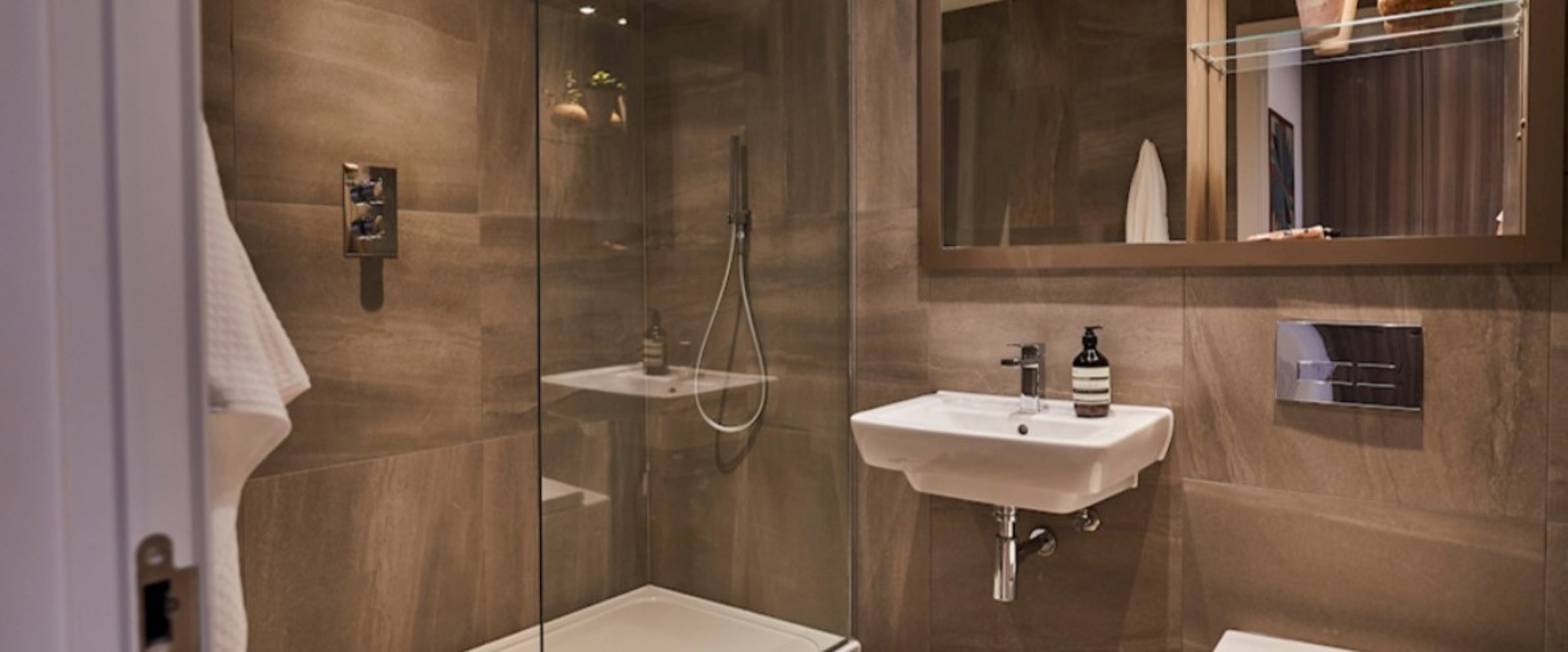 Rainfall shower with separate handheld shower, WC and heated towel rail, plus vanity cabinet with LED lighting. Separate baths available in selected apartments.