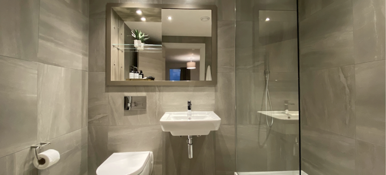 Rainfall shower with separate handheld shower, WC and heated towel rail, plus vanity cabinet with LED lighting. Separate baths available in selected apartments.