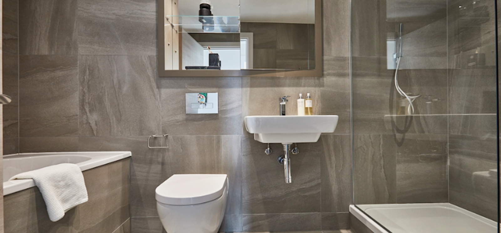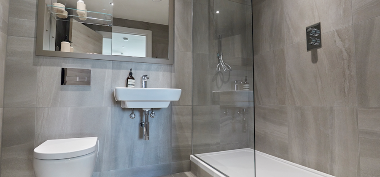 Rainfall shower with separate handheld shower, WC and heated towel rail, plus vanity cabinet with LED lighting. Separate baths available in selected apartments.