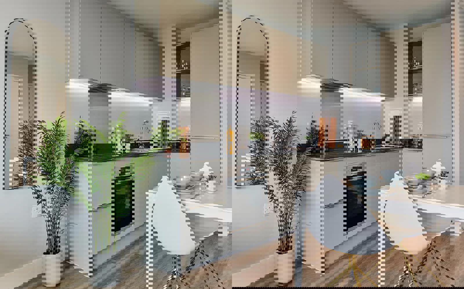 - Open plan, sleek and modern fitted kitchen with dining space