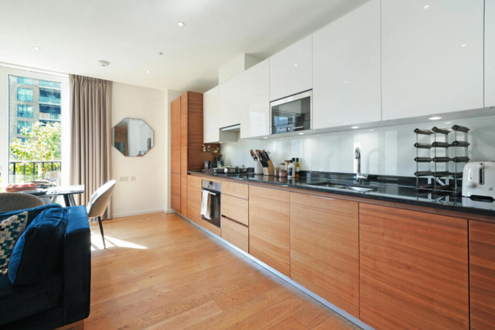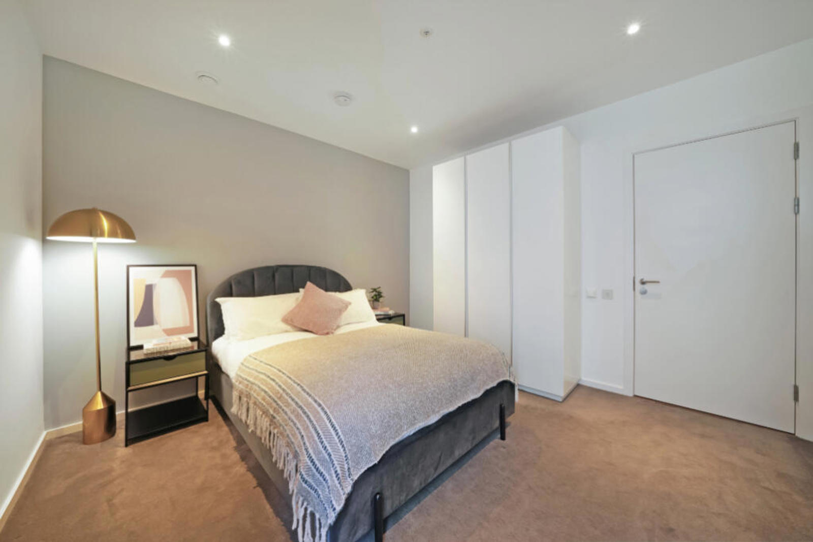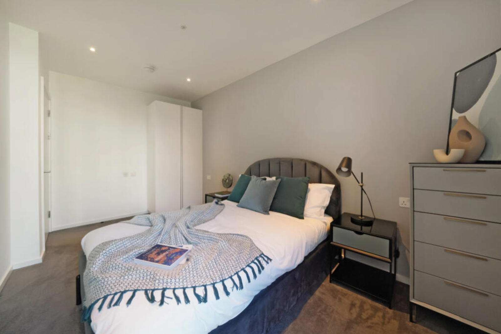 Located on the 5th floor of Sienna House, this light and bright, three bedroom, two bathroom home is available to rent fully-furnished. This East Village apartment sits within Portlands – a popular spot thanks to its tree-lined boulevards and tranquil water features. The double bedrooms come complete with built-in wardrobes, a chest of drawers and side-tables. While kitchens are fully integrated with Bosch appliances including a multi-functional oven and induction hob. A private winter garden connects the open plan kitchen and living area to the great outdoors – overlooking East Village’s parks and wetlands. And for those that love to host dinner parties, this kitchen island is a dream.