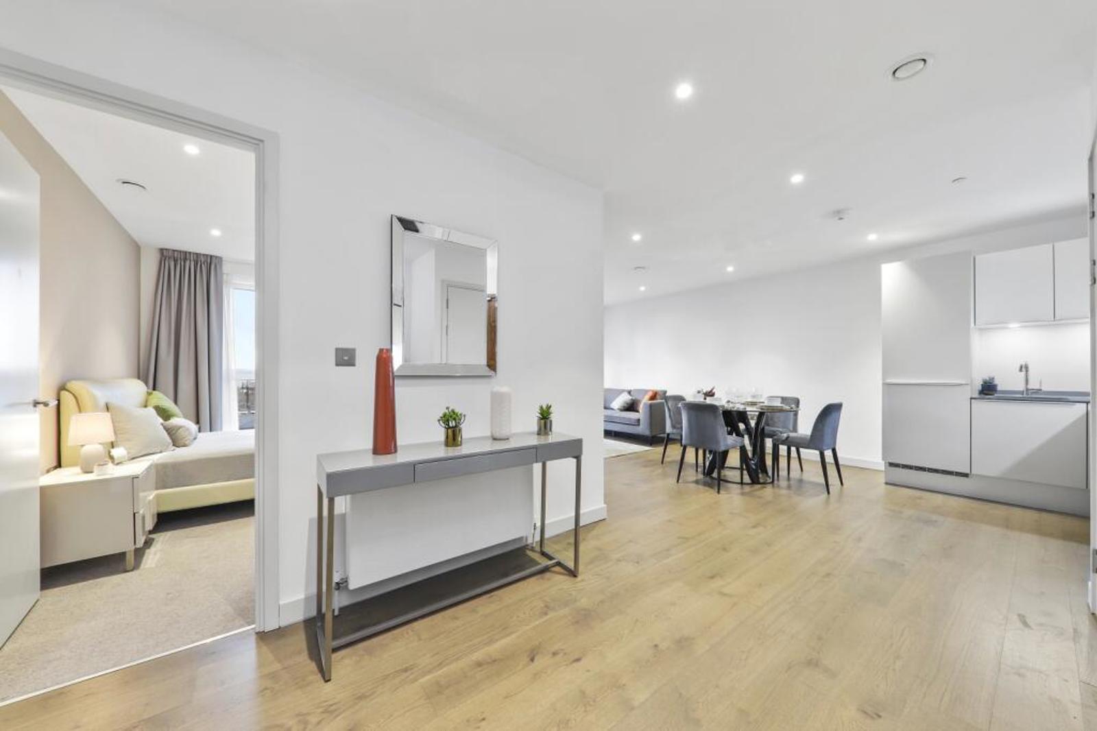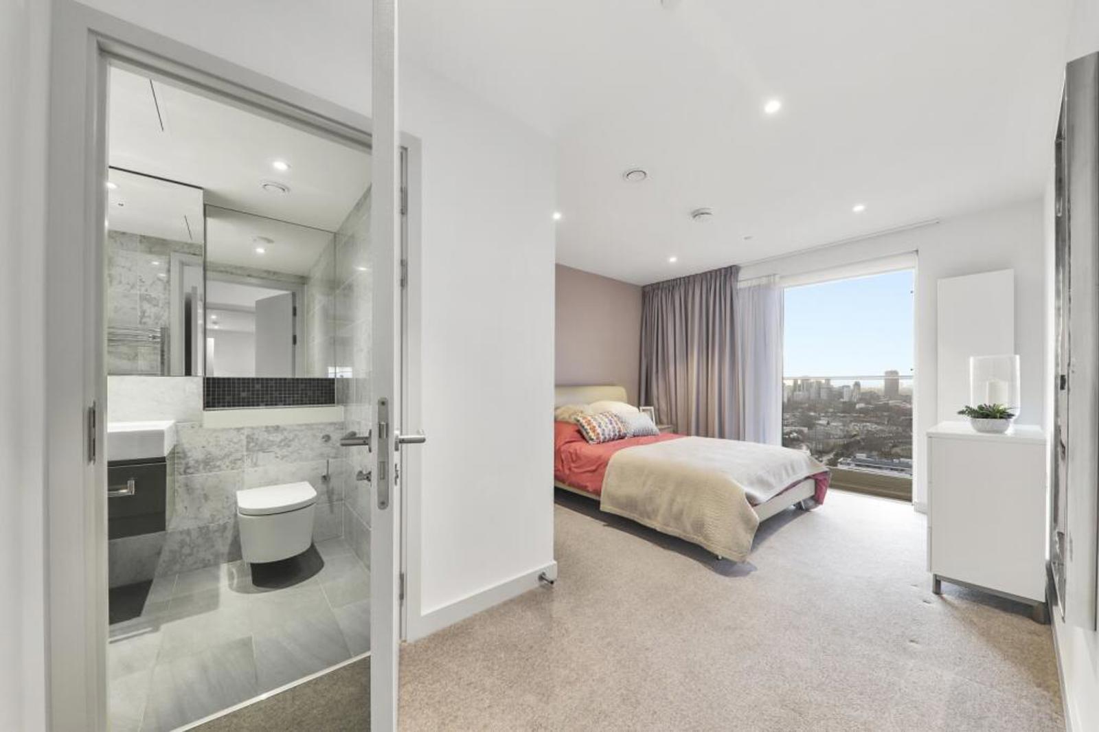 This spacious apartment features an open-plan living area for the kitchen, lounge and dining spaces, with the addition of a large balcony where you can take in some of the best views across London.