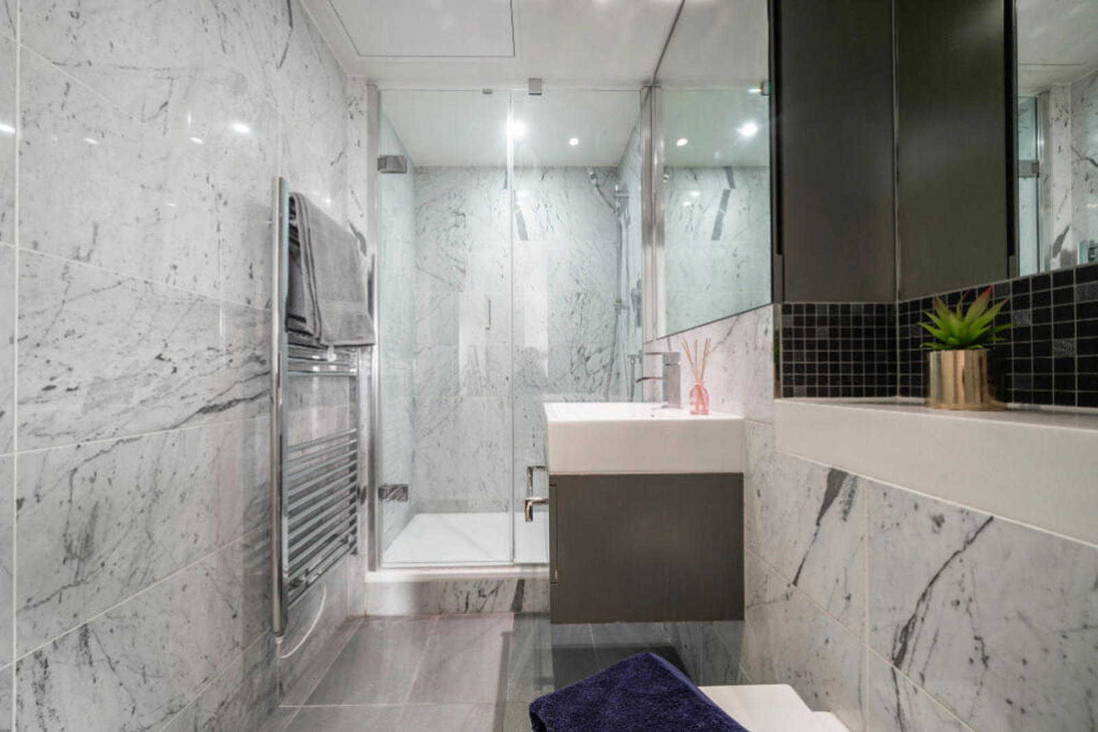 Integrated kitchens feature appliances including a multi-functional oven and induction hob and come with plenty of cupboard space. The bedroom have built-in wardrobes, complemented by a chest of drawers and bedside tables. Marble bathrooms give this property an opulent yet timeless look, with heated mirrors (to prevent steaming) containing even more storage.