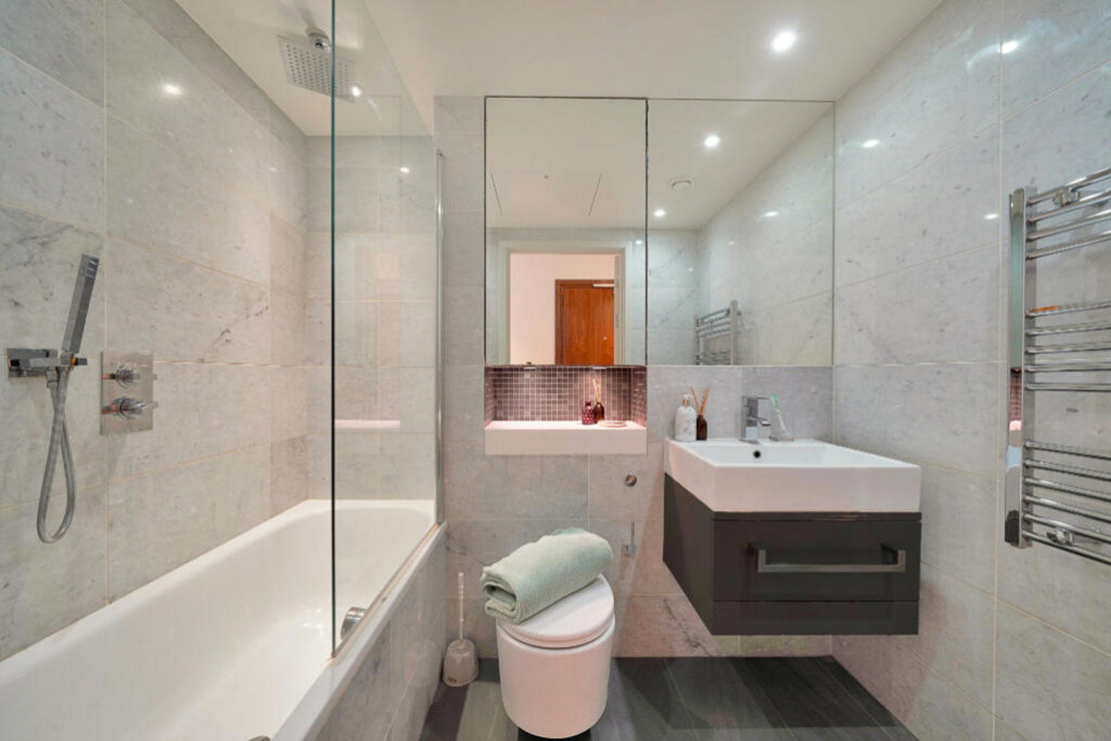 The open plan kitchen, living and dining space opens onto a large private balcony with sweeping views of the London skyline. Find integrated appliances including an induction hob and oven. Bedrooms feature built-in wardrobes, drawers and bedside tables. Marble bathrooms come with heated, anti steam mirrors and plenty of cabinet space.