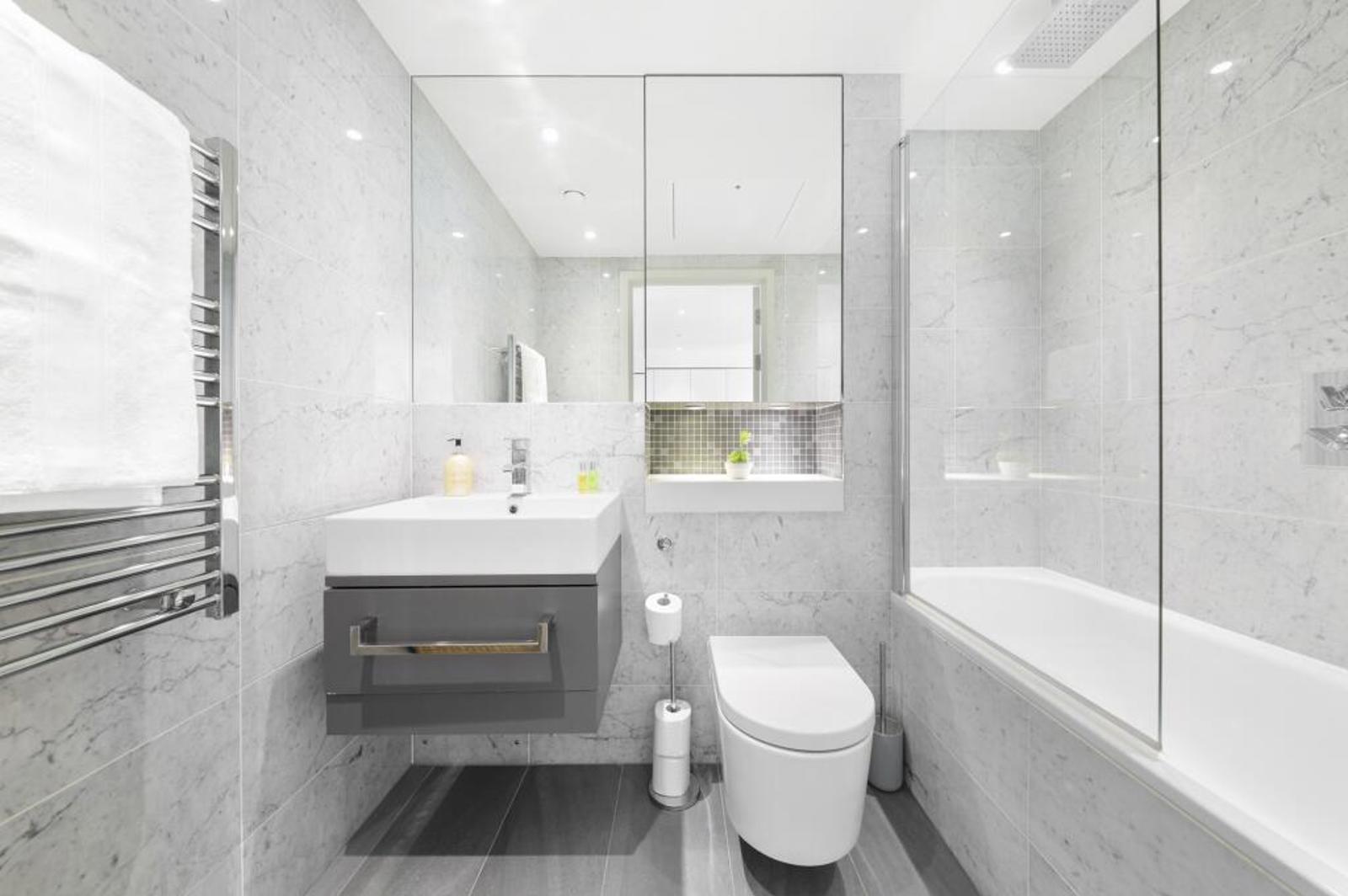The open plan kitchen, living and dining space opens onto a large private balcony with sweeping views of the London skyline. Find integrated appliances including an induction hob and oven. Bedrooms feature built-in wardrobes, drawers and bedside tables. Marble bathrooms come with heated, anti steam mirrors and plenty of cabinet space.