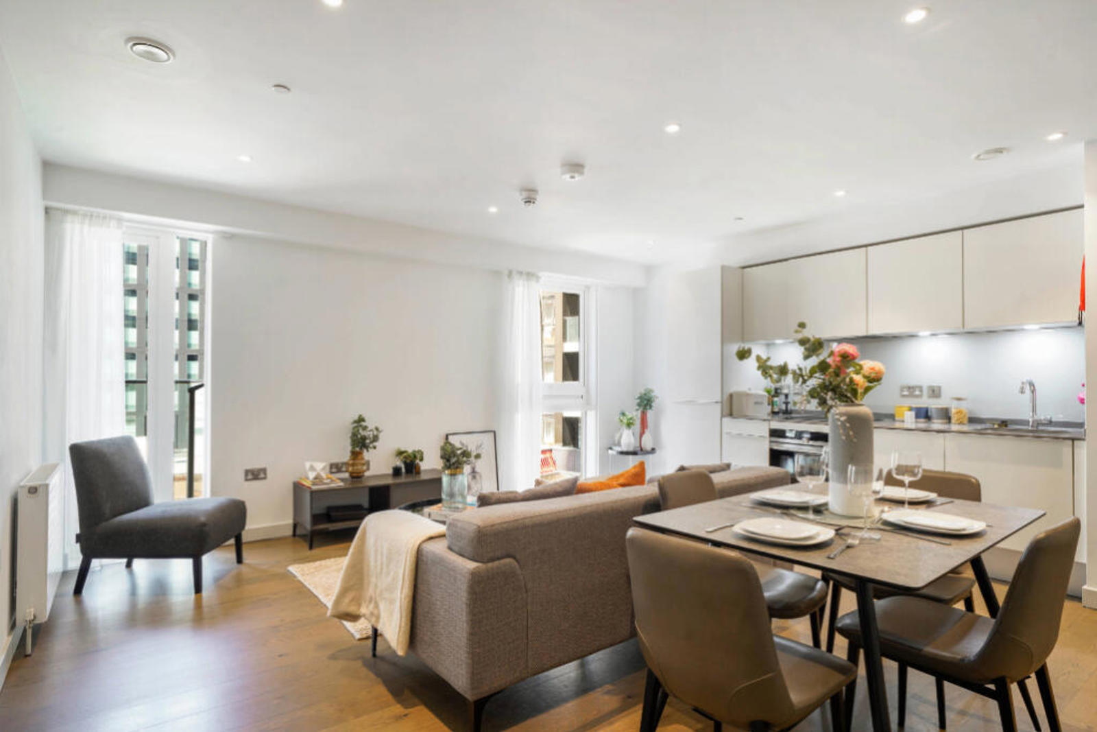 This spacious apartment features an open-plan living area for the kitchen, lounge and dining spaces, with the addition of a large balcony where you can take in some of the best views across London.