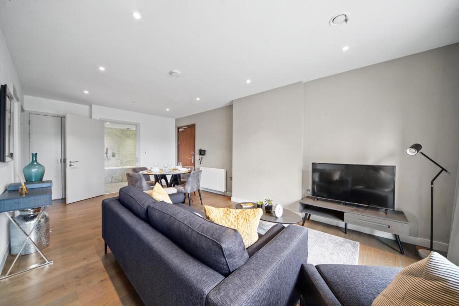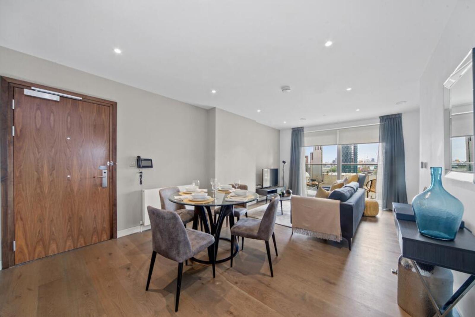 This spacious apartment features an open-plan living area for the kitchen, lounge and dining spaces, with the addition of a large balcony where you can take in some of the best views across London. Integrated kitchens feature appliances including a multi-functional oven and induction hob and come with plenty of cupboard space. The bedrooms have built-in wardrobes, complemented by a chest of drawers and bedside tables. Marble bathrooms give this property an opulent yet timeless look, with heated mirrors (to prevent steaming) containing even more storage.