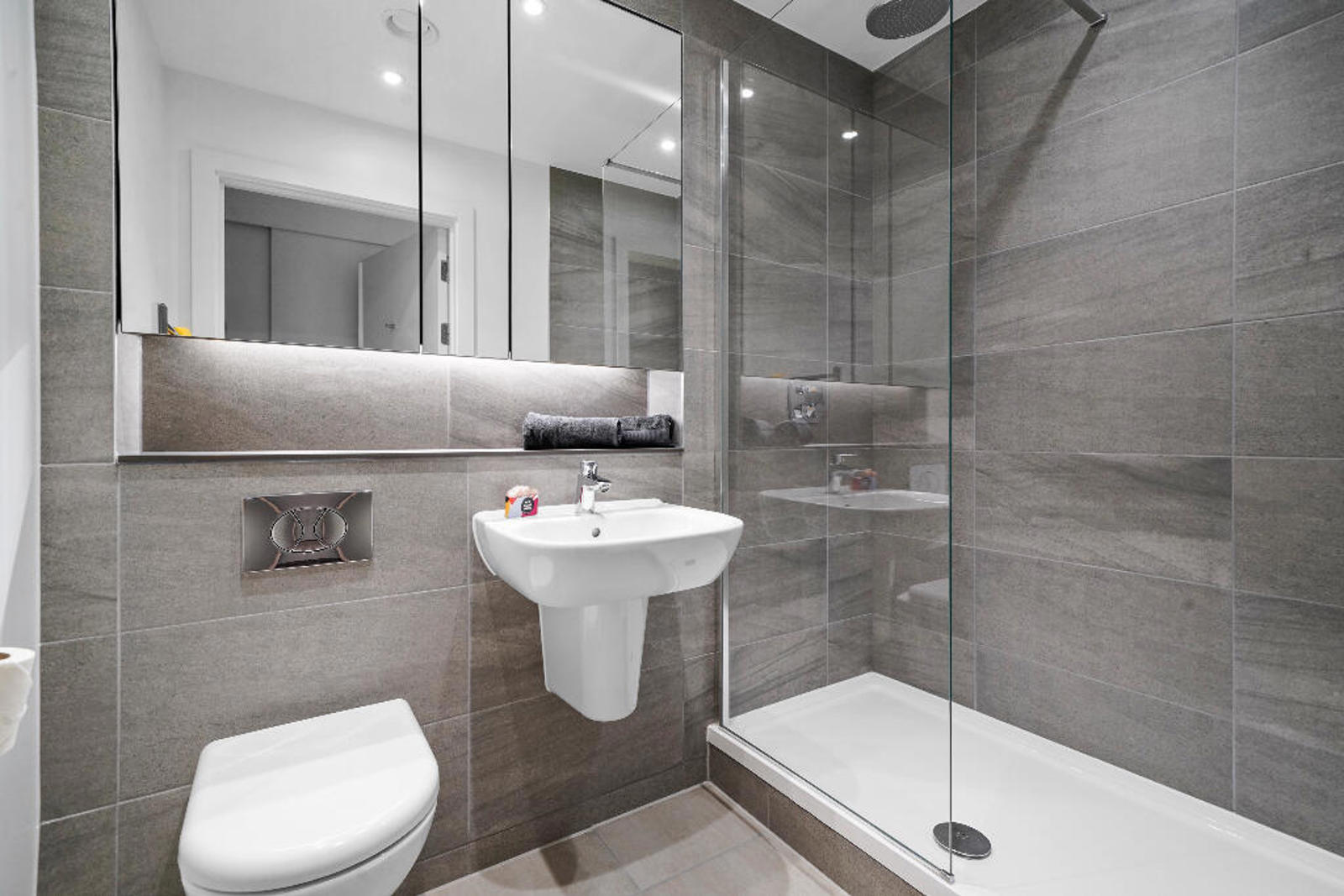 Open the door to this generous open-plan kitchen and living space, furnished with a sofa, comfy armchair, coffee table and TV unit. Integrated kitchens feature a multi-functional oven and induction hob. A private terrace connects the living area to the great outdoors. The double bedrooms come complete with built-in wardrobes, a chest of drawers and side-tables. The bathrooms are completed with a rainfall showerhead and heated mirrors to prevent steaming, with hidden storage. The master room has a spacious ensuite, creating more privacy and space if you’re sharing.