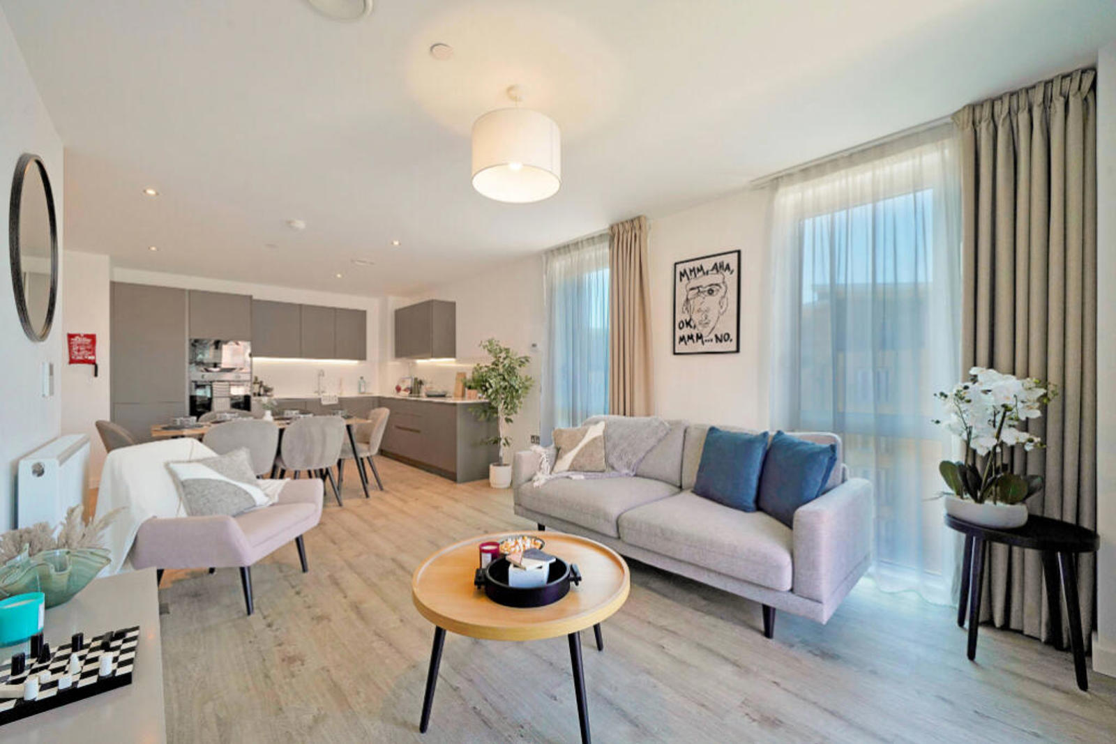 Open the door to this modern home to a generous open-plan kitchen and living space, furnished with a sofa, comfy armchair, coffee table and TV unit. Integrated kitchens feature appliances including a multi-functional oven and induction hob. A private balcony connects the living area to the great outdoors – overlooking the canal. The double bedrooms come complete with built-in wardrobes, a chest of drawers and side-tables. The bathroom is completed with a rainfall showerhead and heated mirrors to prevent steaming, with hidden storage.