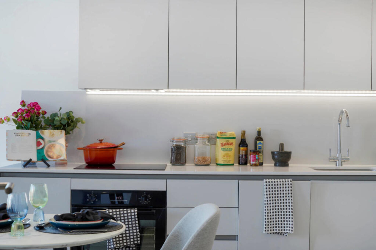 Open the door to this modern home to a generous open-plan kitchen and living space, furnished with a sofa, comfy armchair, coffee table and TV unit. Integrated kitchen appliances including a multi-functional oven and induction hob. A private balcony connects the living area to the great outdoors.