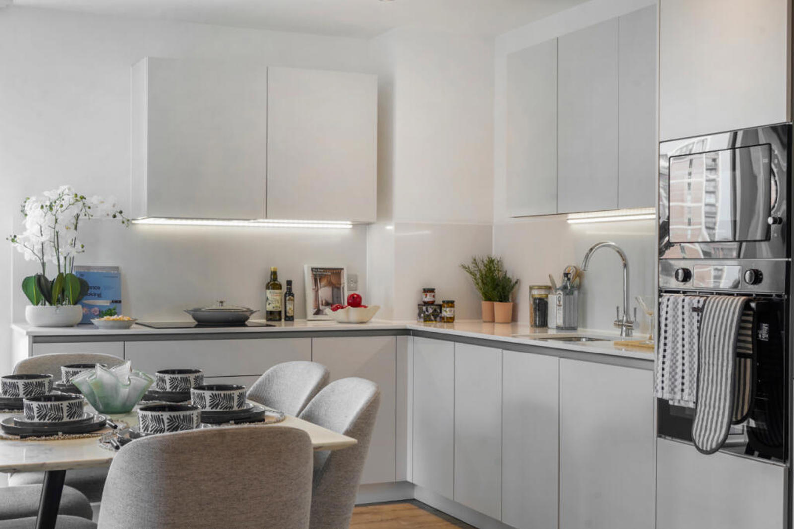 Open the door to this modern home to a generous open-plan kitchen and living space, furnished with a sofa, comfy armchair, coffee table and TV unit. Integrated kitchens feature appliances including a multi-functional oven and induction hob. A private balcony connects the living area to the great outdoors.