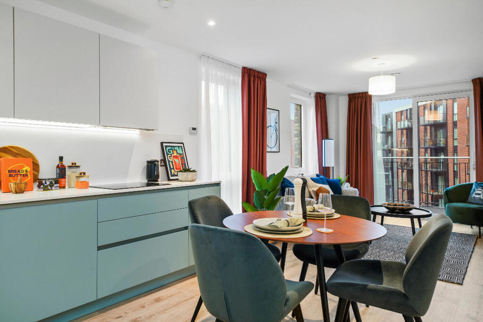 Open the door to this modern home to a generous open-plan kitchen and living space, furnished with a sofa, comfy armchair, coffee table and TV unit. Integrated kitchens feature appliances including a multi-functional oven and induction hob. A private balcony connects the living area to the great outdoors.