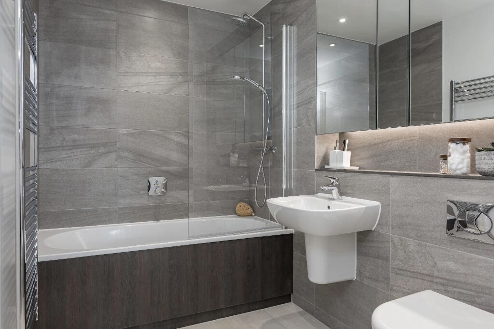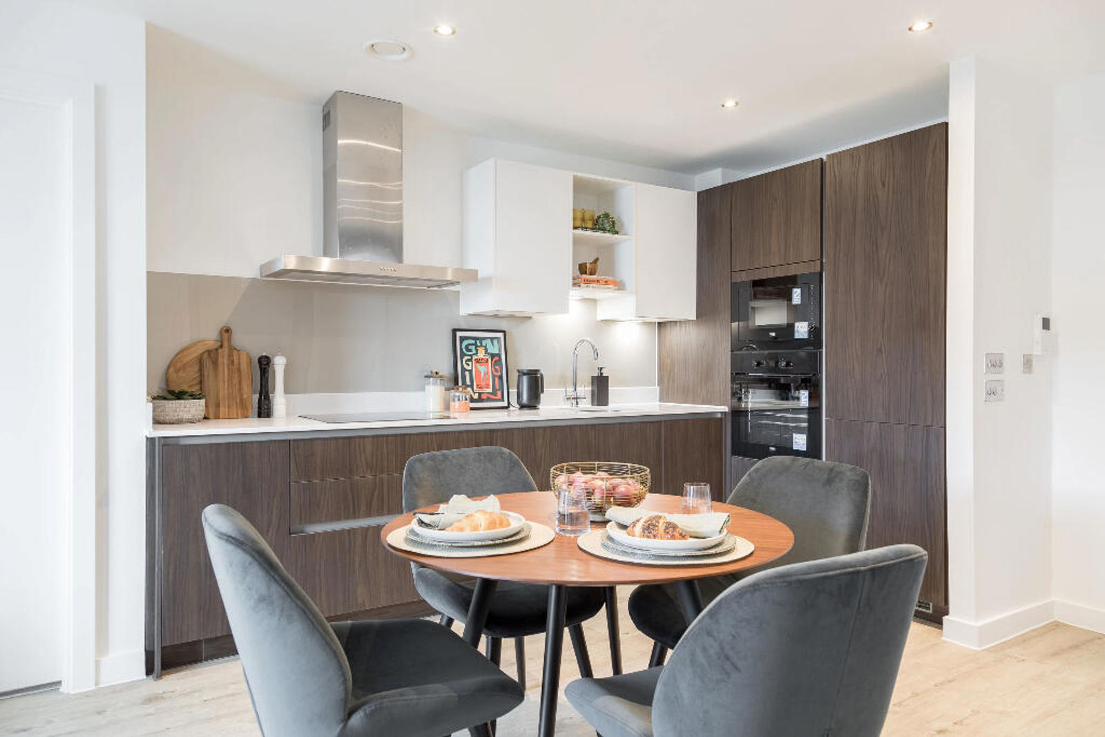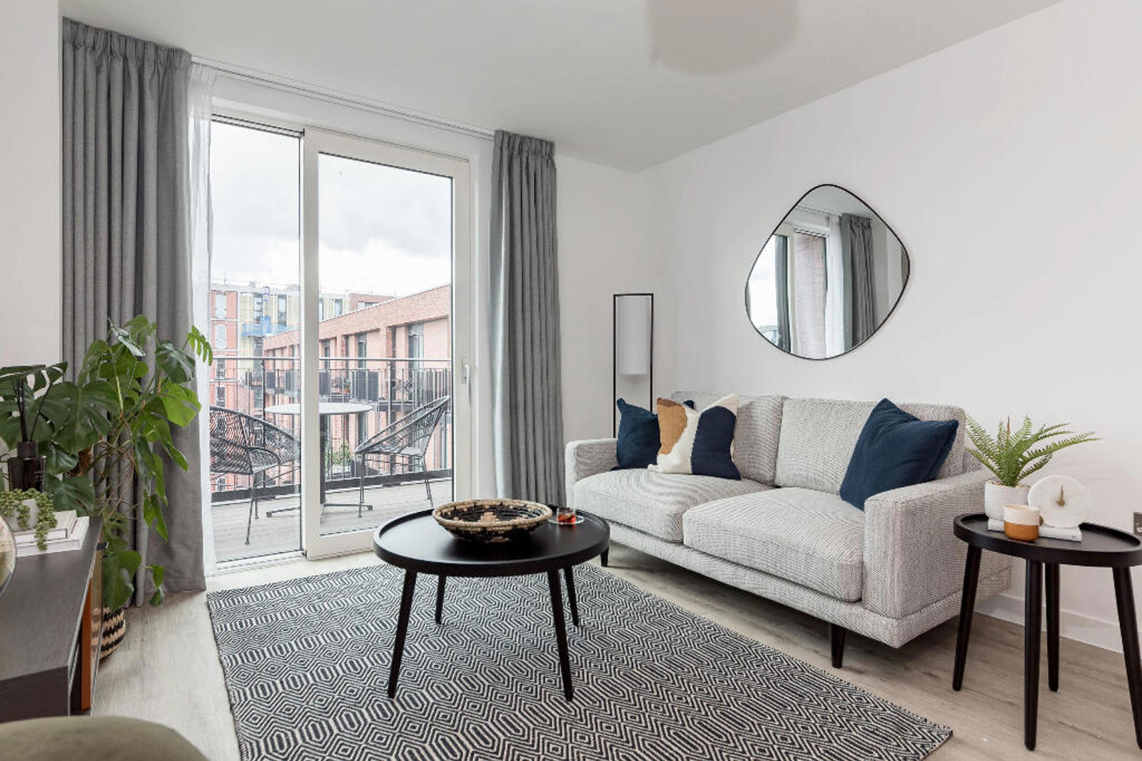 Open the door to this modern home to a generous open-plan kitchen and living space, furnished with a sofa, comfy armchair, coffee table and TV unit. Integrated kitchens feature appliances including a multi-functional oven and induction hob. A private balcony connects the living area to the great outdoors – overlooking the canal. The double bedrooms come complete with built-in wardrobes, a chest of drawers and side-tables. The bathroom is completed with a rainfall showerhead and heated mirrors to prevent steaming, with hidden storage.