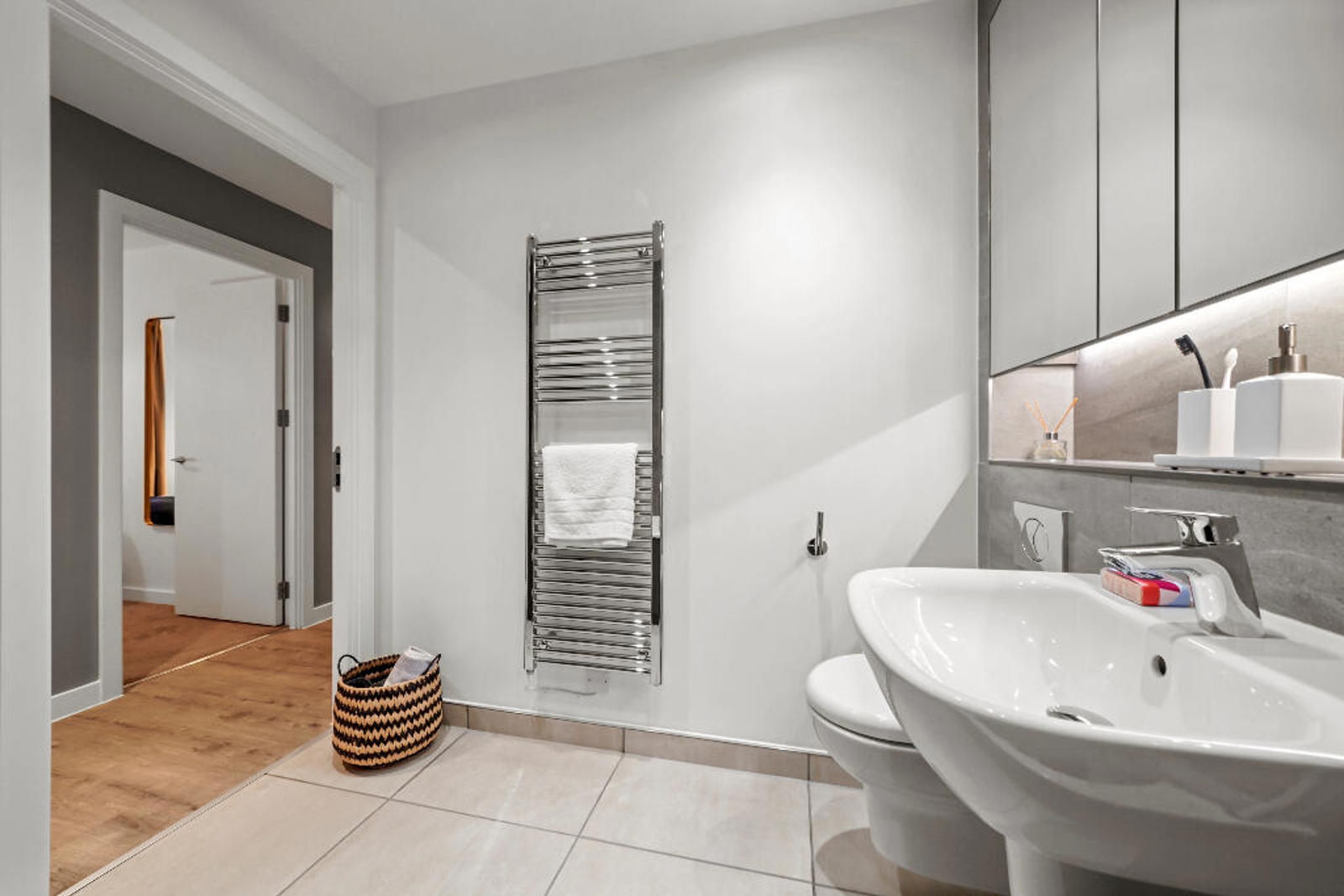 Located on the 4th floor of our Farrier building, this light and bright, two bedroom, two bathroom home is available to rent fully-furnished.
