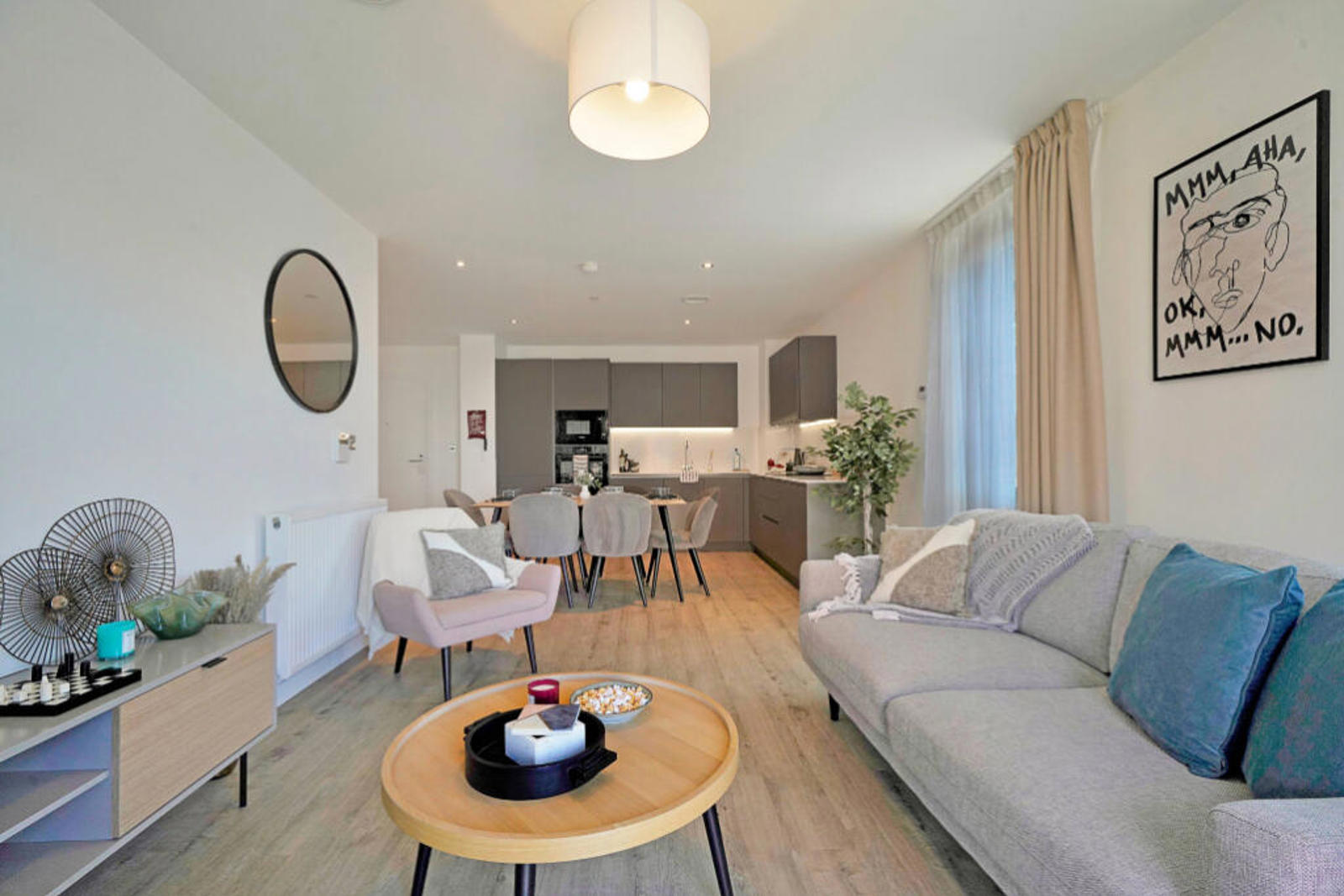 Open the door to this bright home to a generous open-plan kitchen and living space, furnished with a sofa, comfy armchair, coffee table and TV unit. Integrated kitchens feature appliances including a multi-functional oven and induction hob. A private balcony connects the living area to the great outdoors.