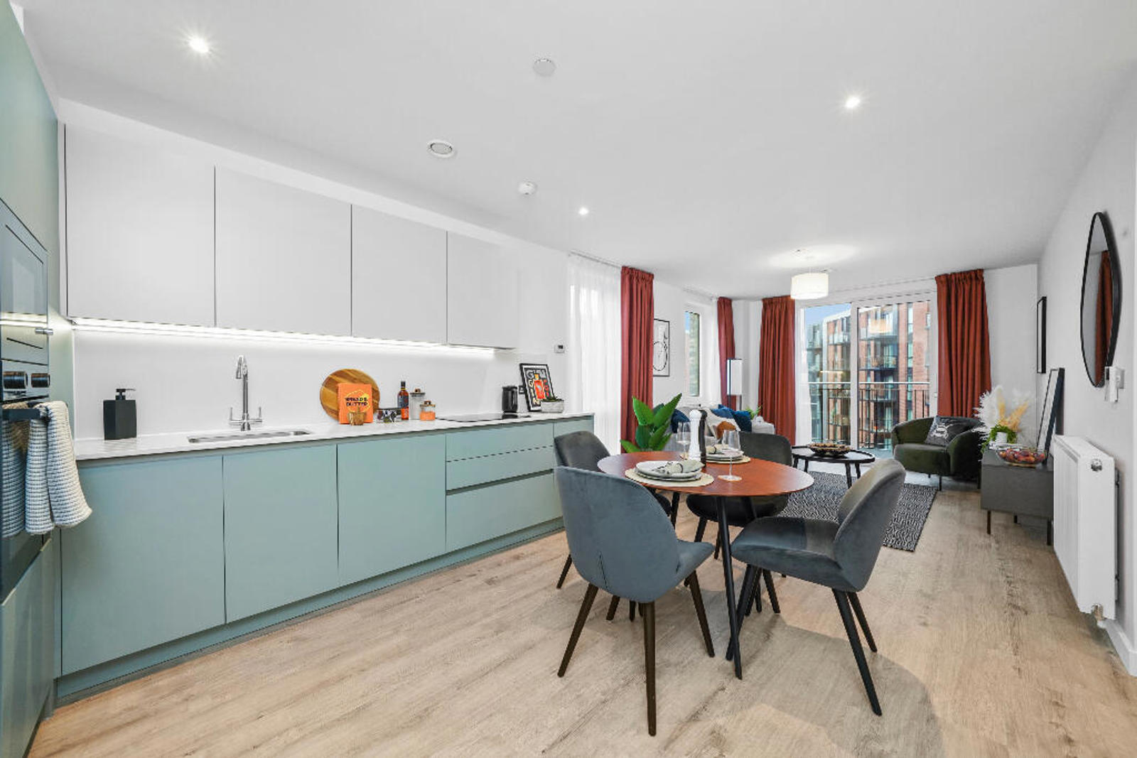 Open the door to this bright home to a generous open-plan kitchen and living space, furnished with a sofa, comfy armchair, coffee table and TV unit. Integrated kitchens feature appliances including a multi-functional oven and induction hob. A private balcony connects the living area to the great outdoors.