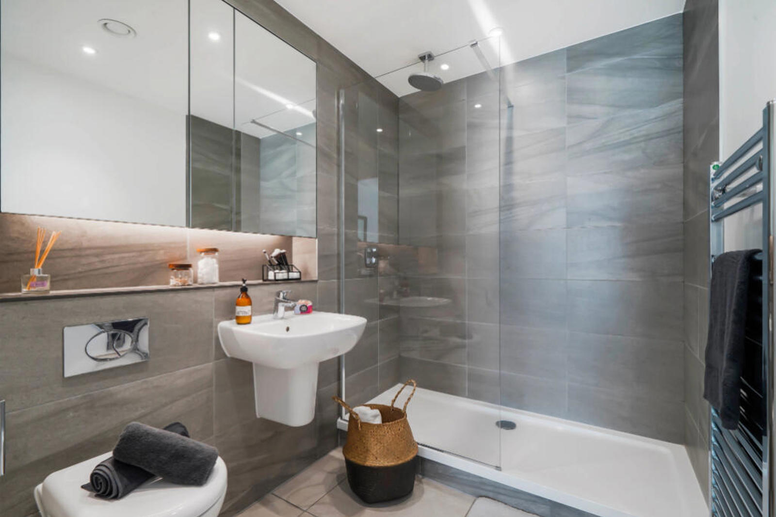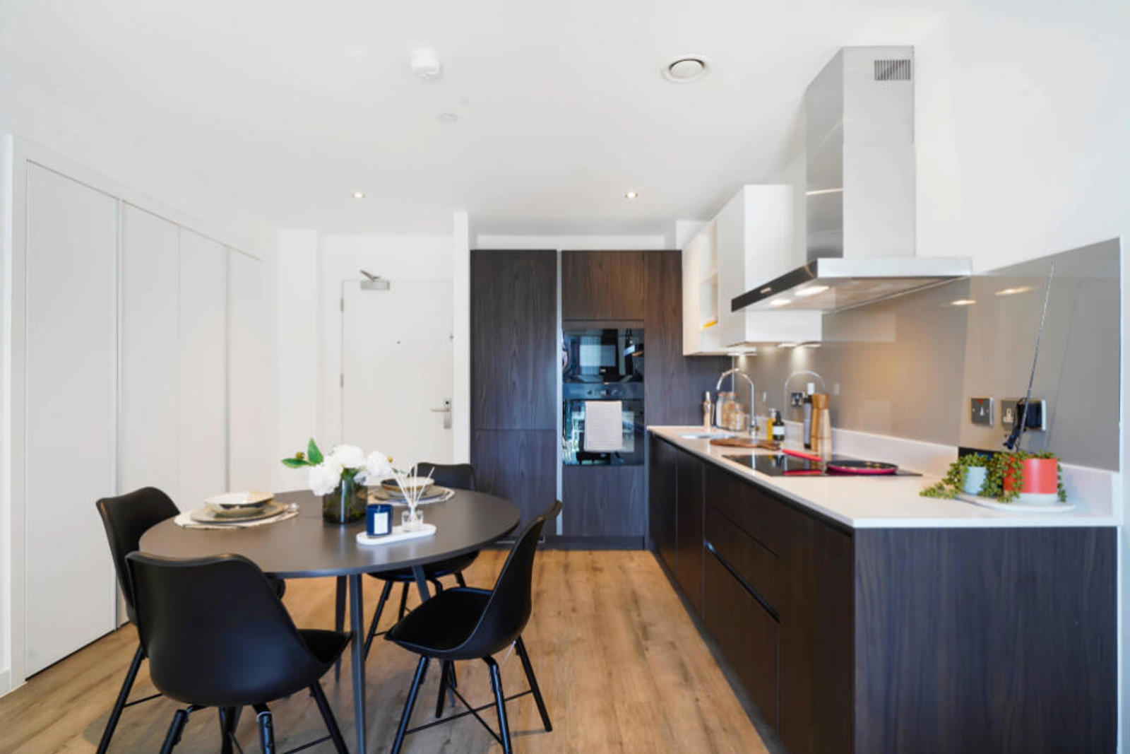 Open the door to this bright home to a generous open-plan kitchen and living space, furnished with a sofa, comfy armchair, coffee table and TV unit. Integrated kitchens feature [insert] appliances including a multi-functional oven and induction hob. The double bedrooms come complete with built-in wardrobes, a chest of drawers and side-tables. The bathrooms is completed with a rainfall showerhead and heated mirrors to prevent steaming, with hidden storage.