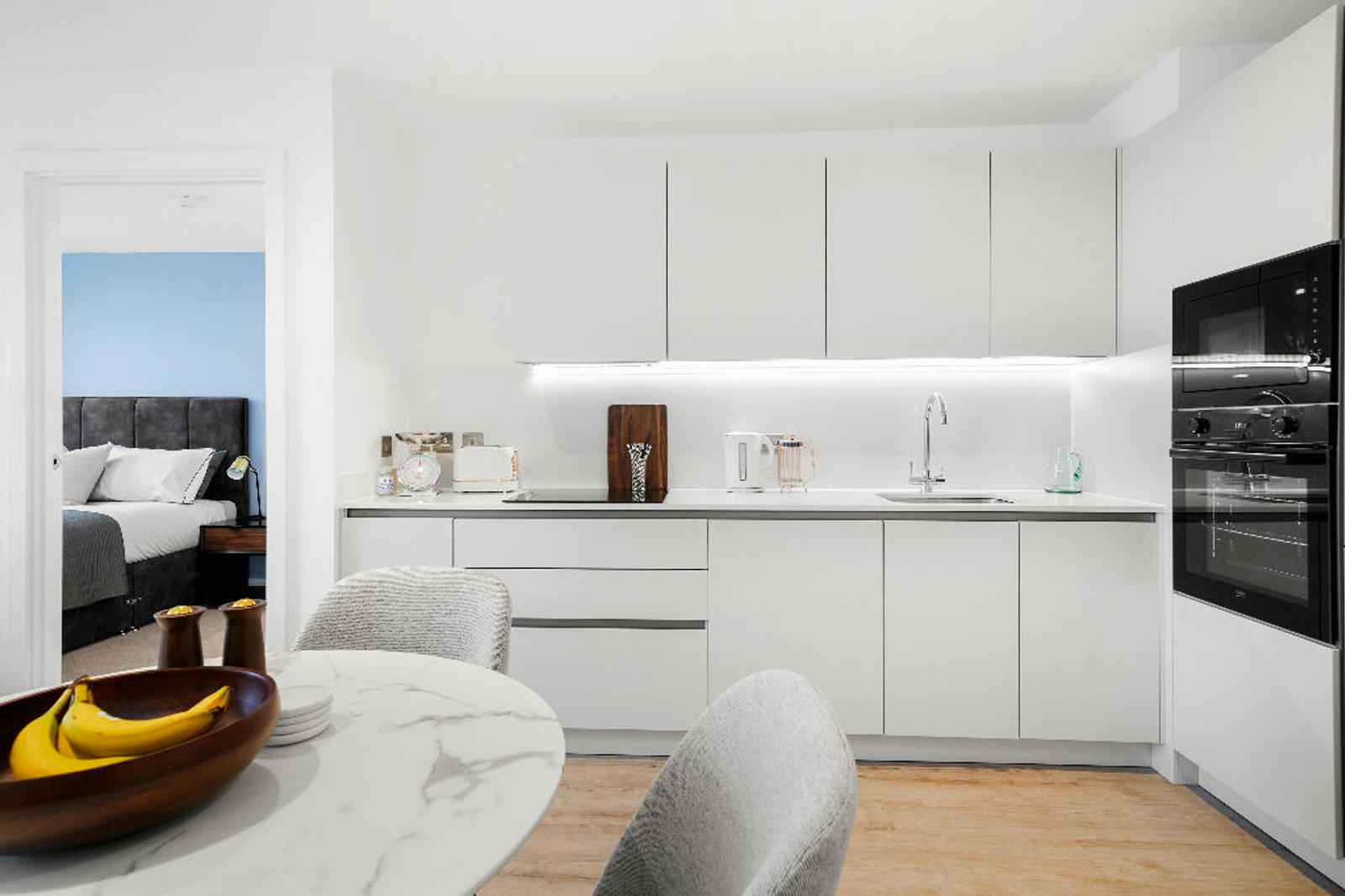 Open the door to this bright home to a generous open-plan kitchen and living space, furnished with a sofa, comfy armchair, coffee table and TV unit. Integrated kitchens feature [insert] appliances including a multi-functional oven and induction hob. The double bedrooms come complete with built-in wardrobes, a chest of drawers and side-tables. The bathrooms is completed with a rainfall showerhead and heated mirrors to prevent steaming, with hidden storage.