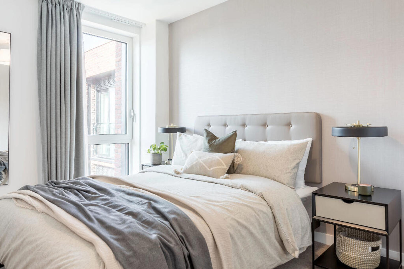 Open the door to this modern home to a generous open-plan kitchen and living space, furnished with a sofa, comfy armchair, coffee table and TV unit. Integrated kitchens feature appliances including a multi-functional oven and induction hob. A private balcony connects the living area to the great outdoors – overlooking the canal. The double bedrooms come complete with built-in wardrobes, a chest of drawers and side-tables. The bathroom is completed with a rainfall showerhead and heated mirrors to prevent steaming, with hidden storage.