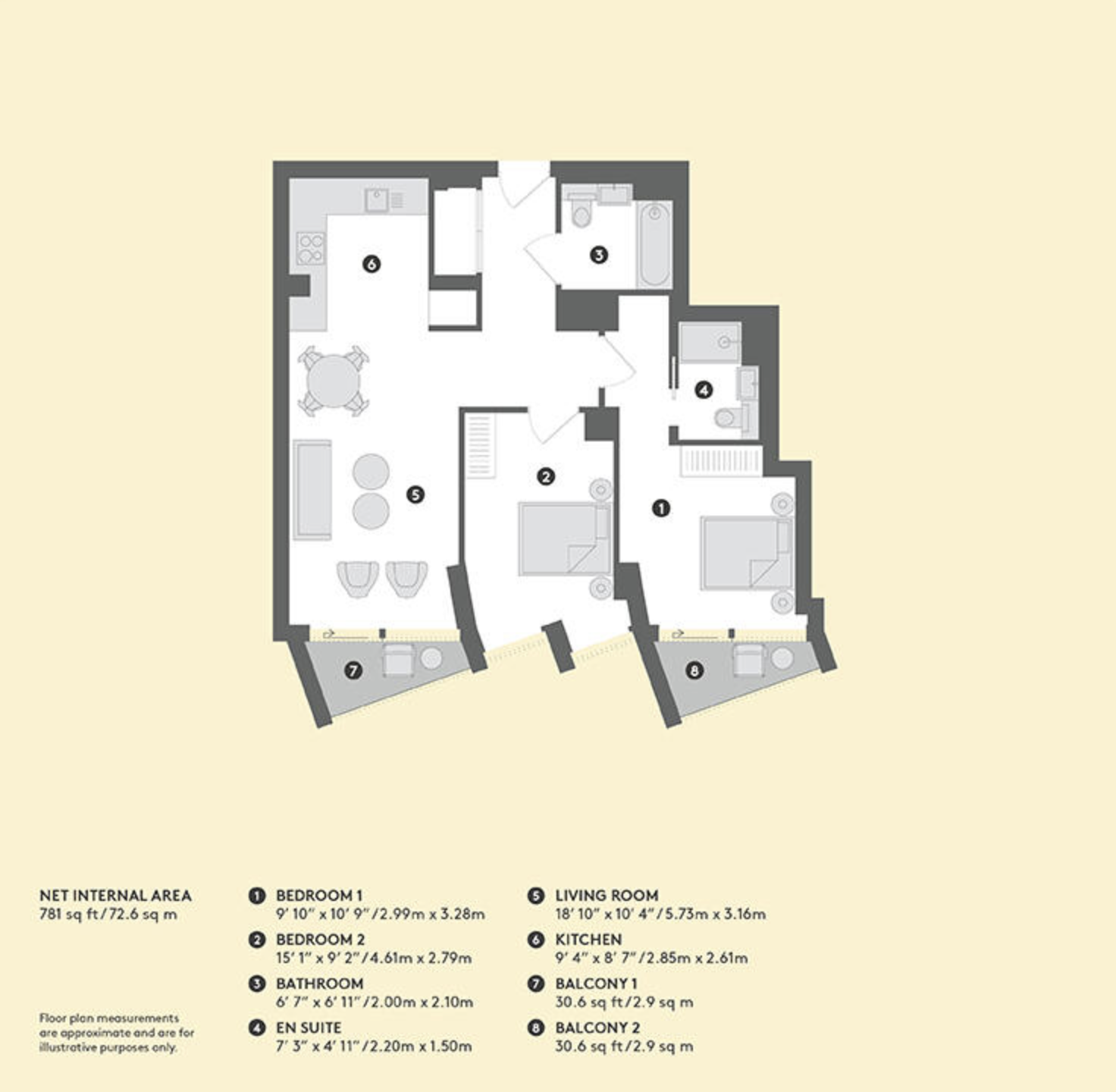 A modern and luxury two-bedroom, two-bathroom apartment at No.4 Upper Riverside, Greenwich Peninsula. Complete with access to residents' swimming pool, gyms, roof terraces, media room, cinema and 24-hour concierge.