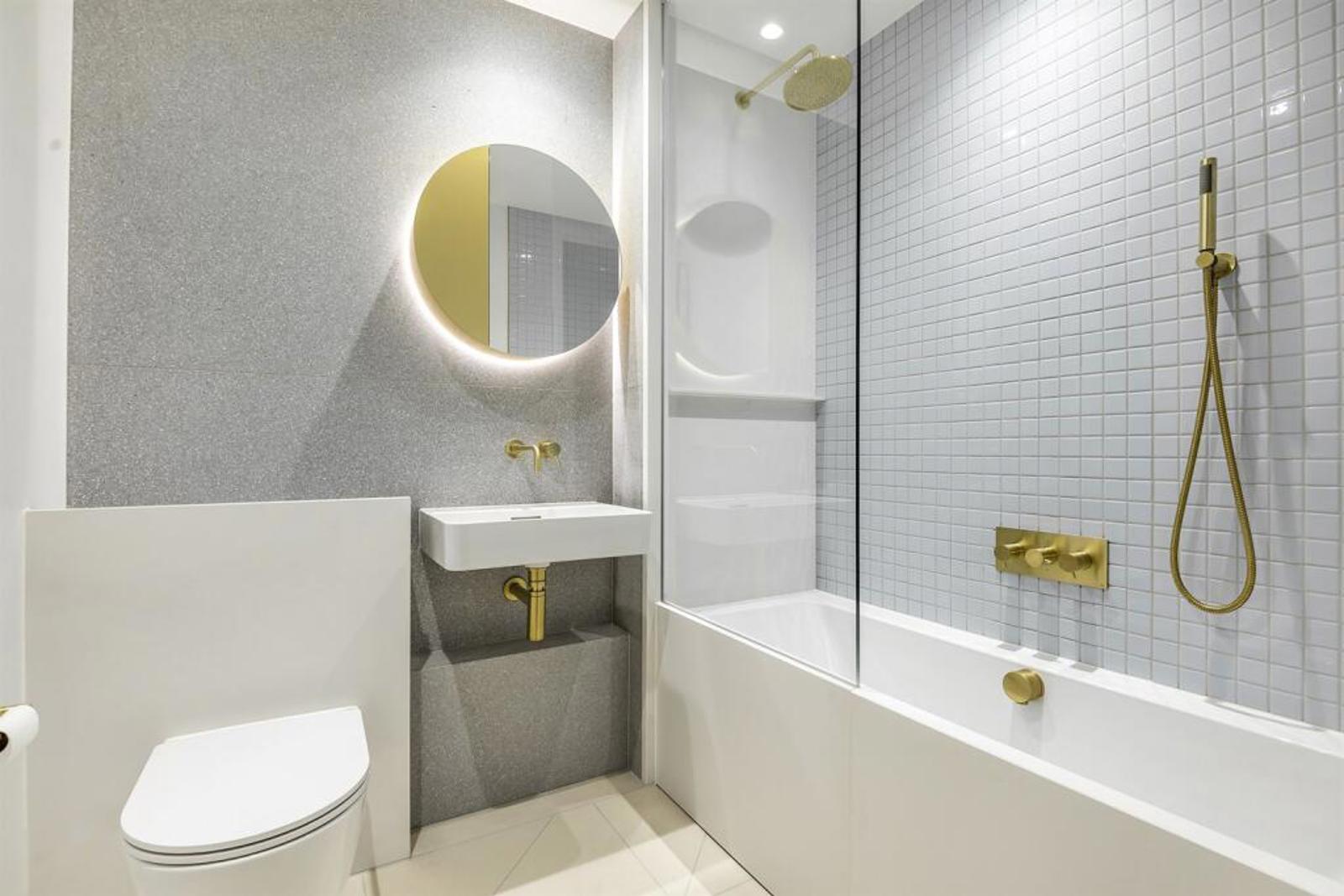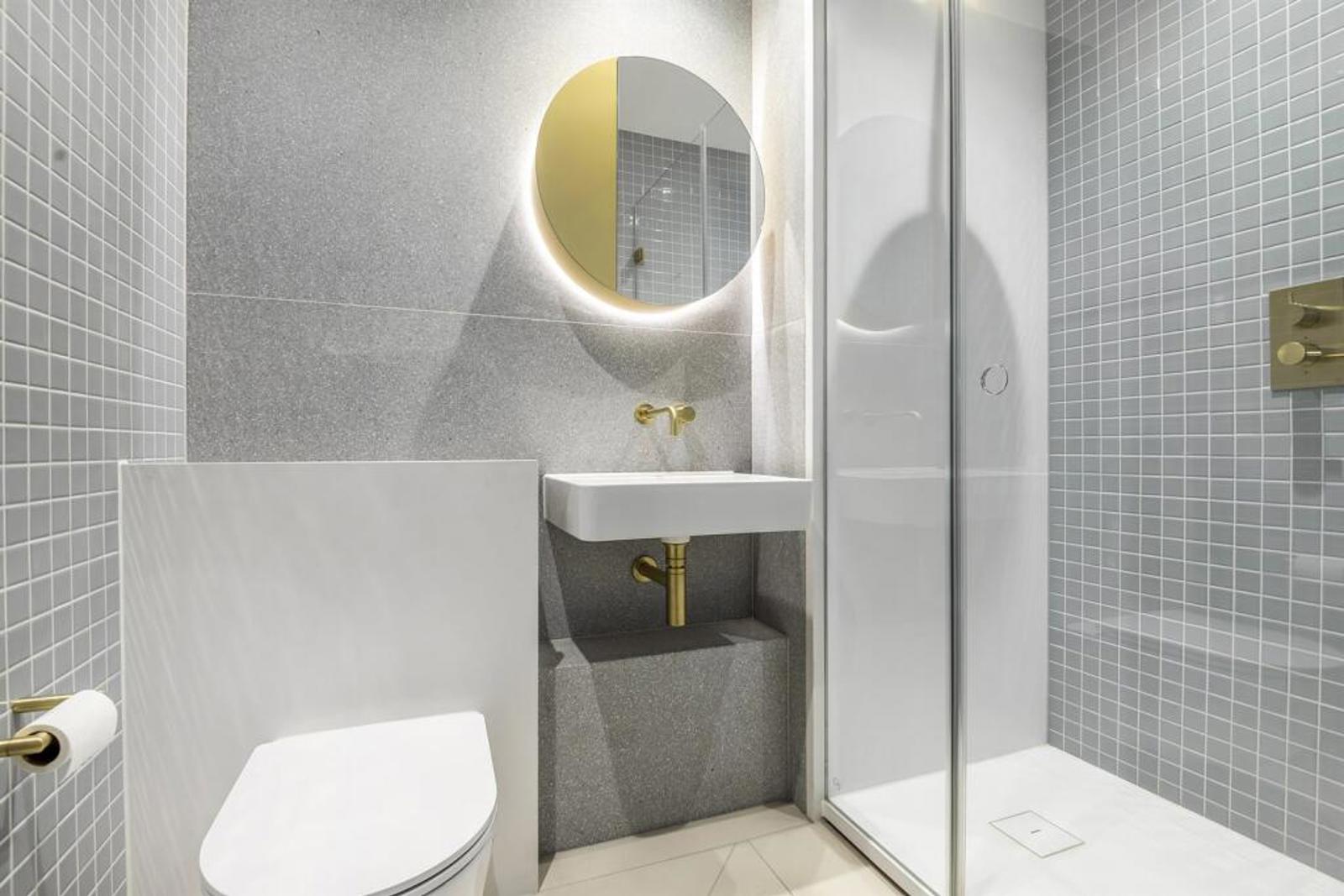 Glazed tiling, terrazzo paneling and brass fittings give the bathrooms a touch of class, as do the kitchens with Caesarstone worktops and oak veneered shelving.