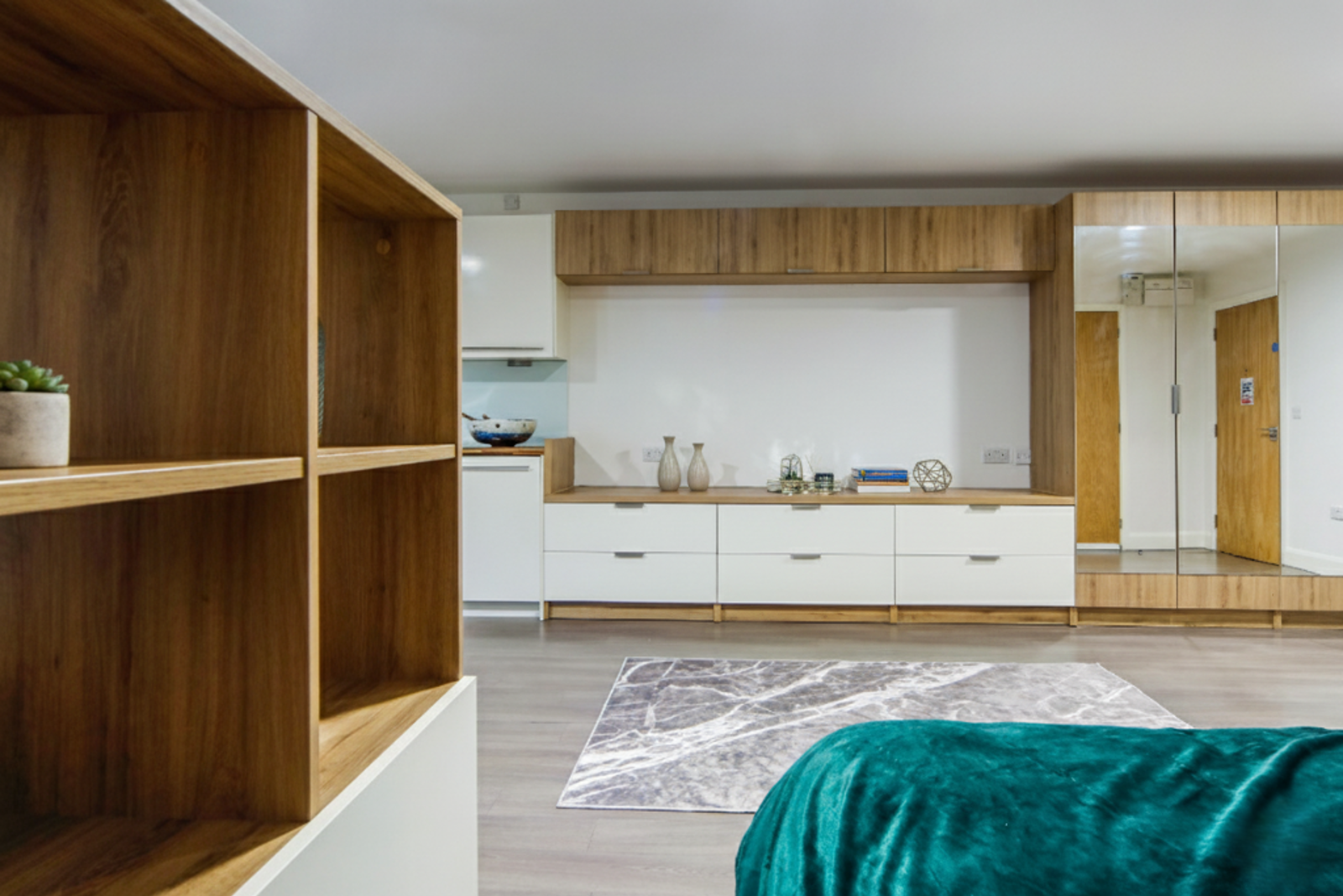 All our studios include extensive inbuilt storage, double bed, sofa, kitchen table and built-in kitchen and shower rooms. These homes are in the Court and exclusively available for key workers.