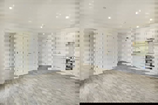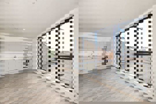 The apartment features an open, airy living space with integrated appliances, providing a sleek and functional layout.
