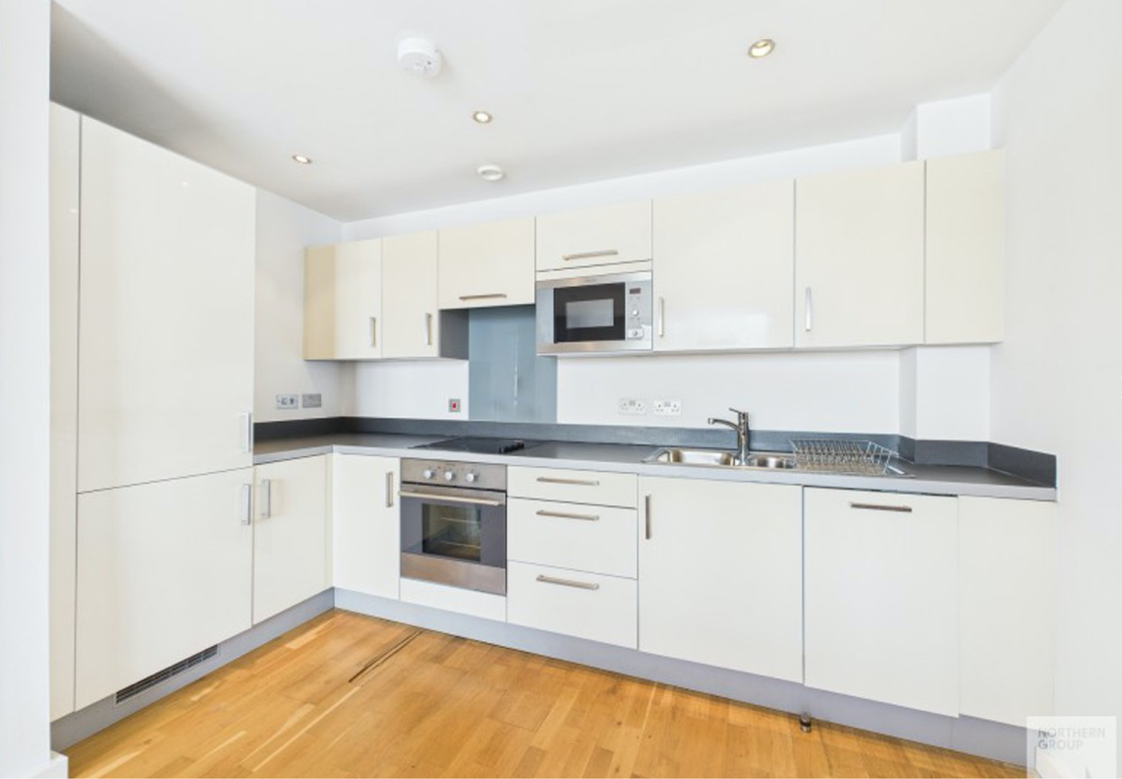 - Contemporary kitchen with a full range of integrated appliances including dishwasher, microwave and washing machine
