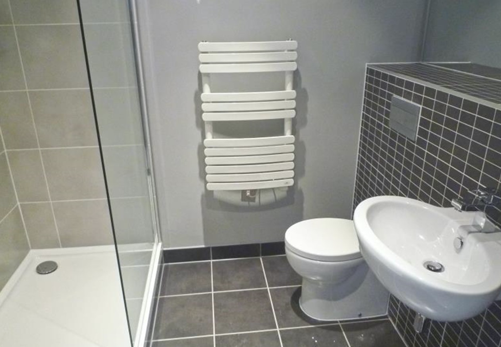 - Designer bathroom by Porcelanosa with white sanitary ware and contrasting large format tiling to walls and floors