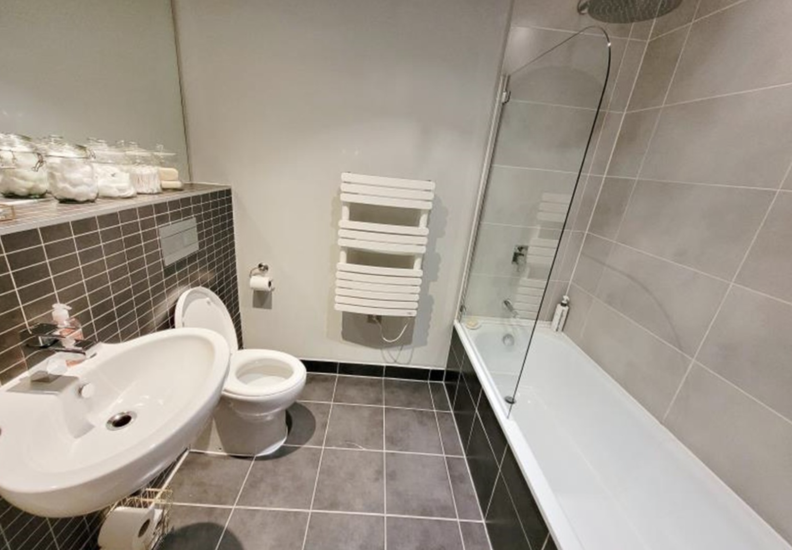 - Designer bathroom by Porcelanosa with white sanitary ware and contrasting large format tiling to walls and floors