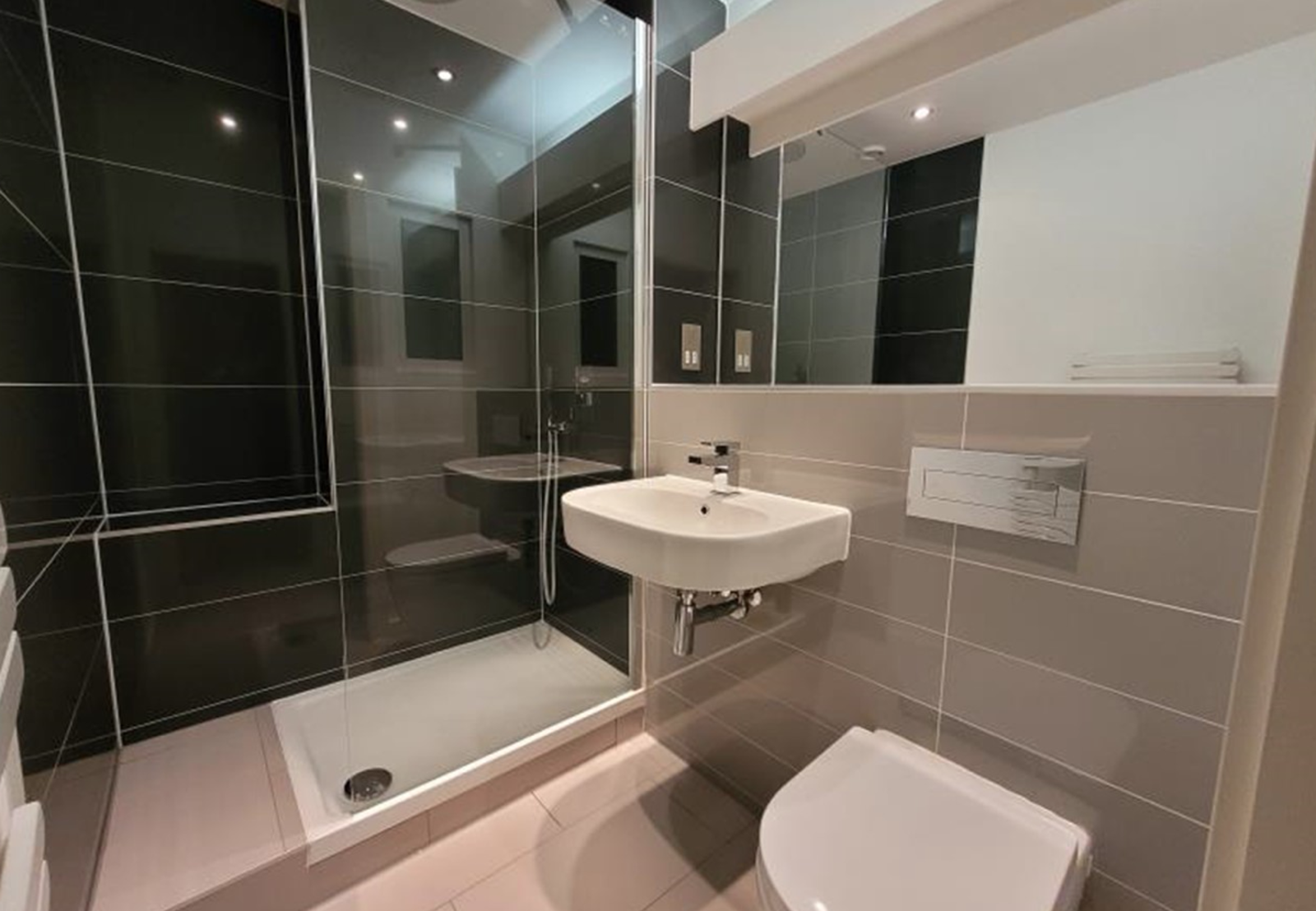 - Luxury bathroom with sanitary ware by Porcelanosa, stylish chrome fittings and rain shower. Large format glass tiling, heated towel rail and mirrored wall