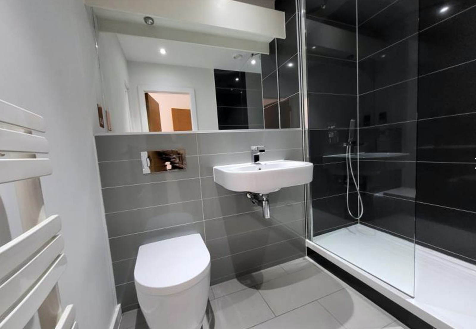 - Luxury bathroom with sanitary ware by Porcelanosa, stylish chrome fittings and rain shower. Large format glass tiling, heated towel rail and mirrored wall