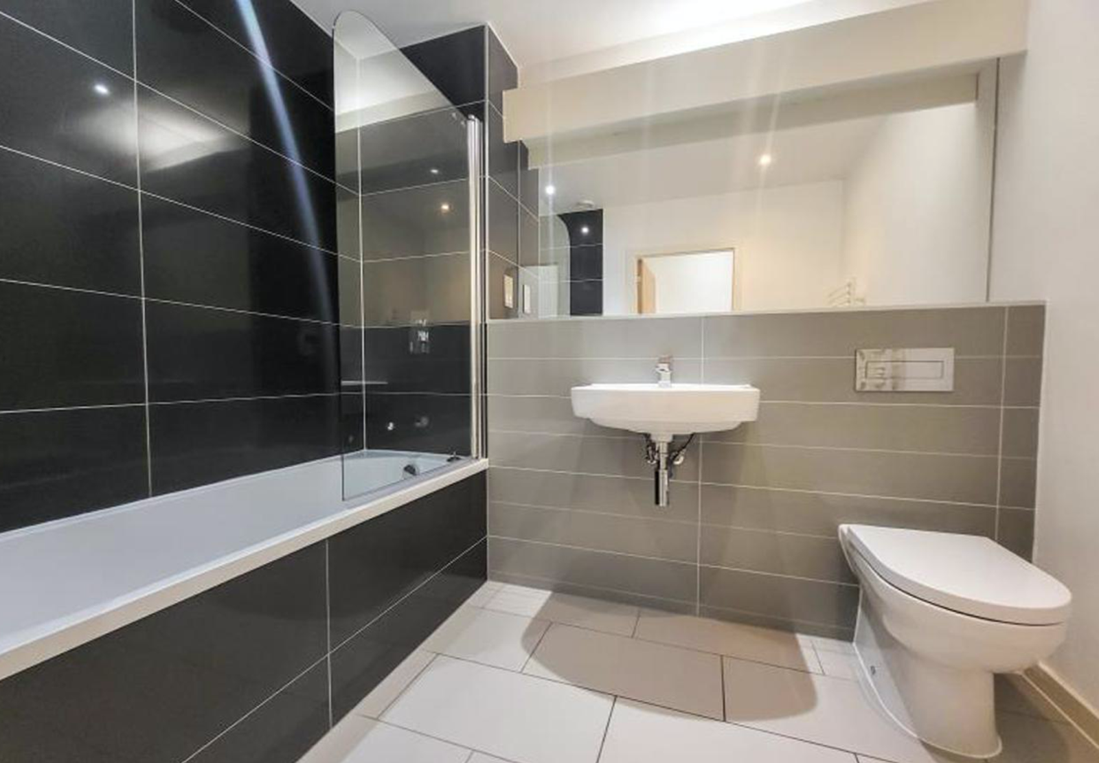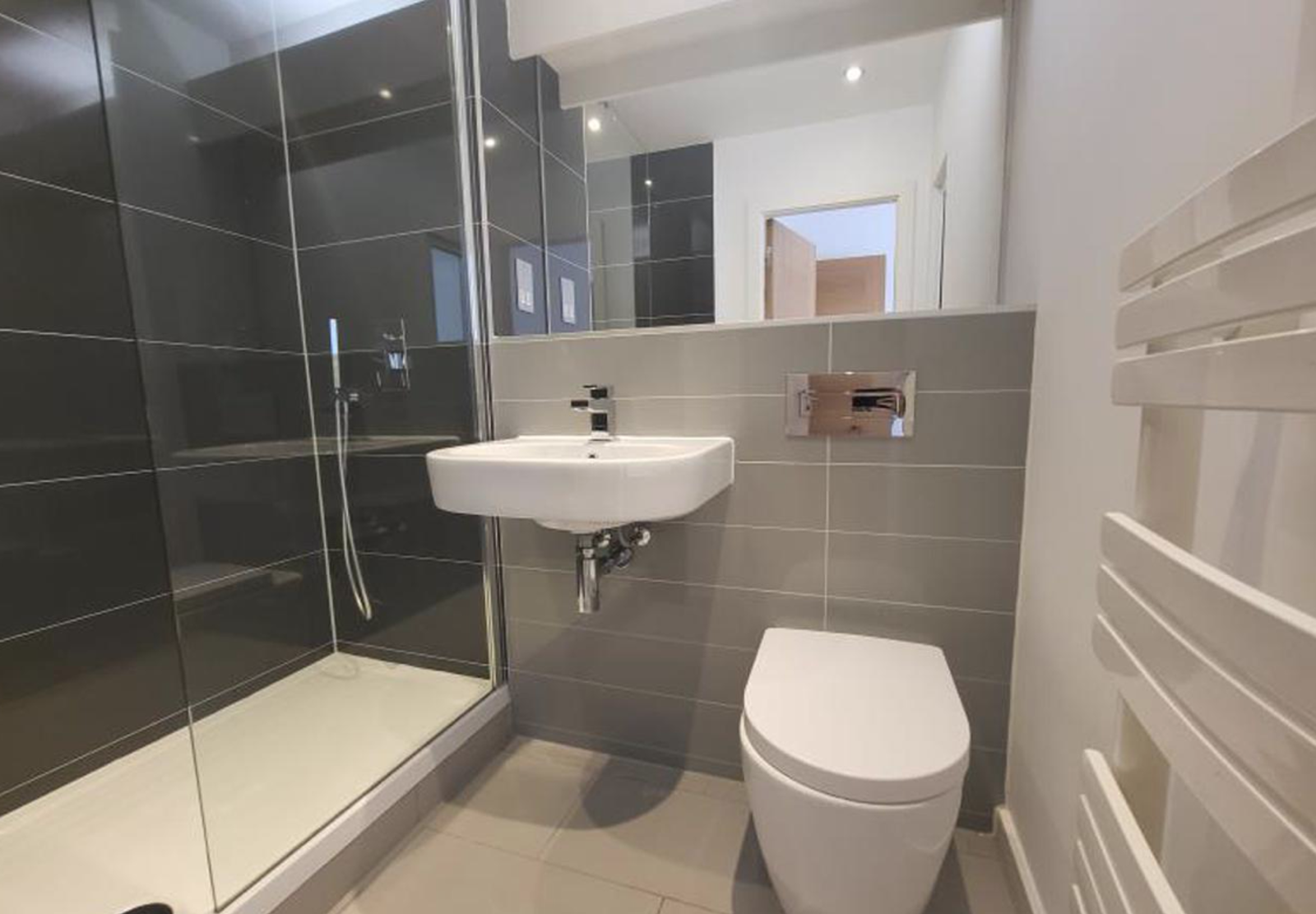- Luxury bathroom with sanitary ware by Porcelanosa, stylish chrome fittings and rain shower. Large format glass tiling, heated towel rail and mirrored wall