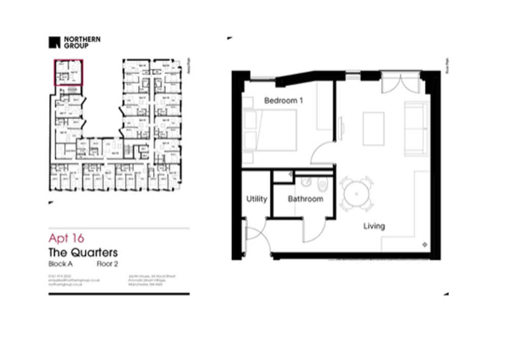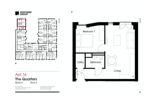 Managed by Northern Group, we are pleased to present this stunning one bedroom apartment on the 2nd floor of The Quarters in the heart of Manchester’s Northern Quarter.