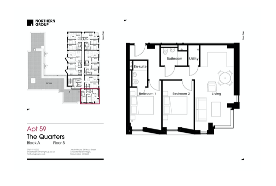 Luxury two bedroom unfurnished apartment on the 5th floor of The Quarters in the heart of Manchester’s Northern Quarter.