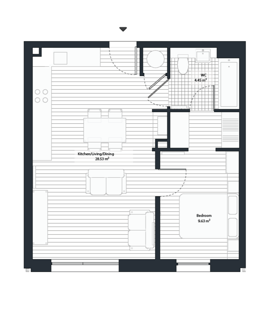 Our 1-bedroom apartments feature an open-plan layout that seamlessly integrates the kitchen, living, and dining areas. The fully integrated kitchen includes a hob, oven, dishwasher, and fridge freezer.