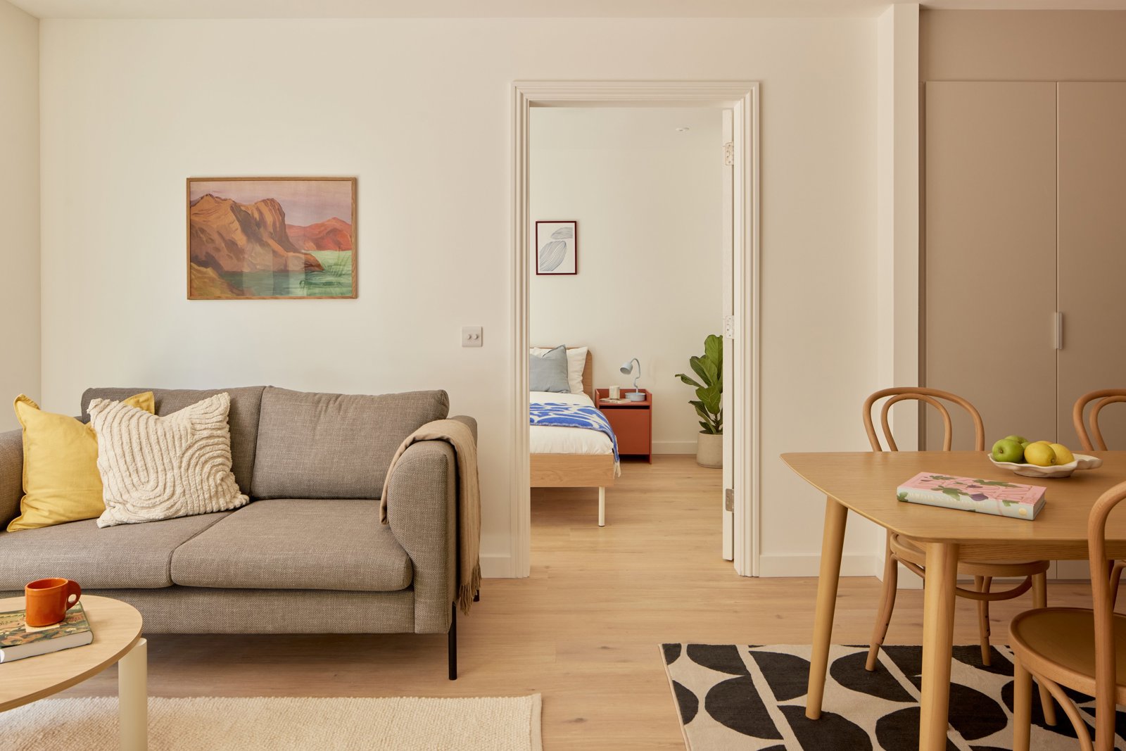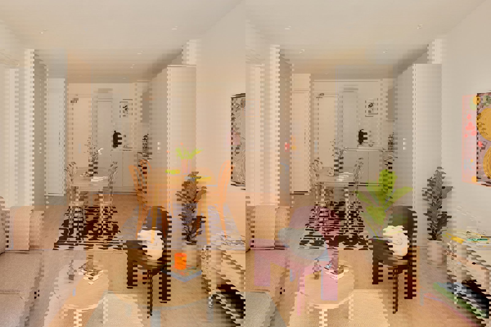 Our apartments feature an open-plan layout that seamlessly integrates the kitchen, living, and dining areas.