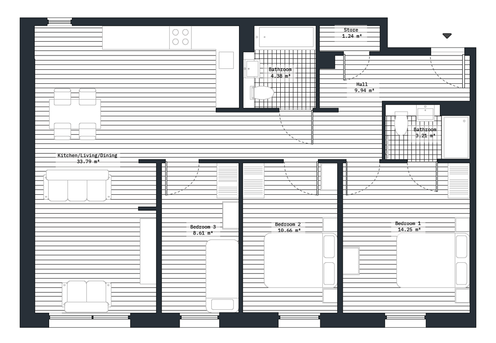 Our 3-bedroom apartments are a designed fit for families and feature an open-plan layout that seamlessly integrates the kitchen, living and dining areas. The fully integrated kitchen includes a hob, oven, dishwasher, and fridge freezer.