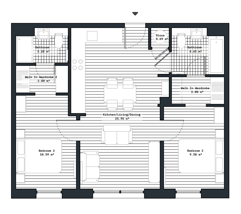 Our 2-bedroom apartments feature an open-plan layout that seamlessly integrates the kitchen, living, and dining areas. The fully integrated kitchen includes a hob, oven, dishwasher, and fridge freezer.