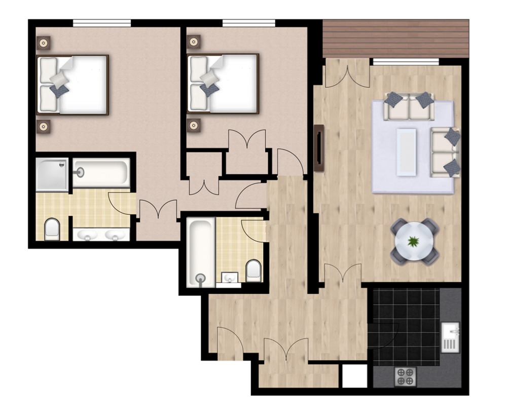 Whether you're looking for a cozy one-bedroom or spacious two-bedroom unit, our interior-designed spaces are perfect for entertaining and working from home with floor-to-ceiling windows flooding the rooms with natural light.