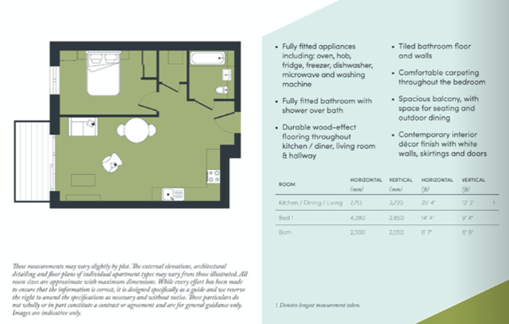 Stepping into the apartment, you are immediately greeted with the open plan kitchen, living and dining space. The kitchen comes with fully integrated appliances, with the rest of the room easily dedicated to dining and enjoying views through the sliding doors of your generous balcony.