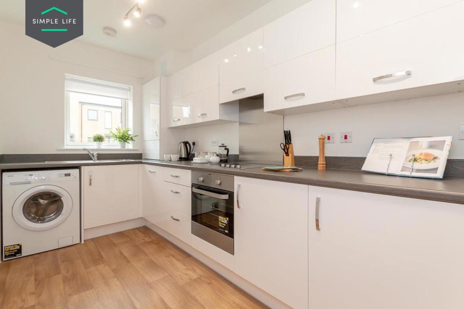- Fully integrated kitchen appliances including: electric oven, ceramic hob, washer/drier, fridge/freezer and dishwasher