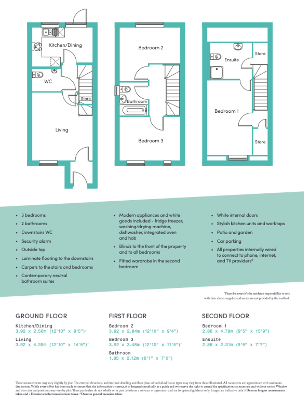 - Fully fitted white bathroom suite, downstairs WC and ensuites where applicable with washbasins, baths and showers