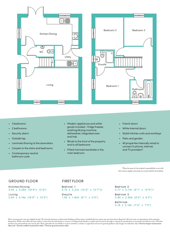 - Fully fitted white bathroom suite, downstairs WC and ensuites where applicable with washbasins, baths and showers