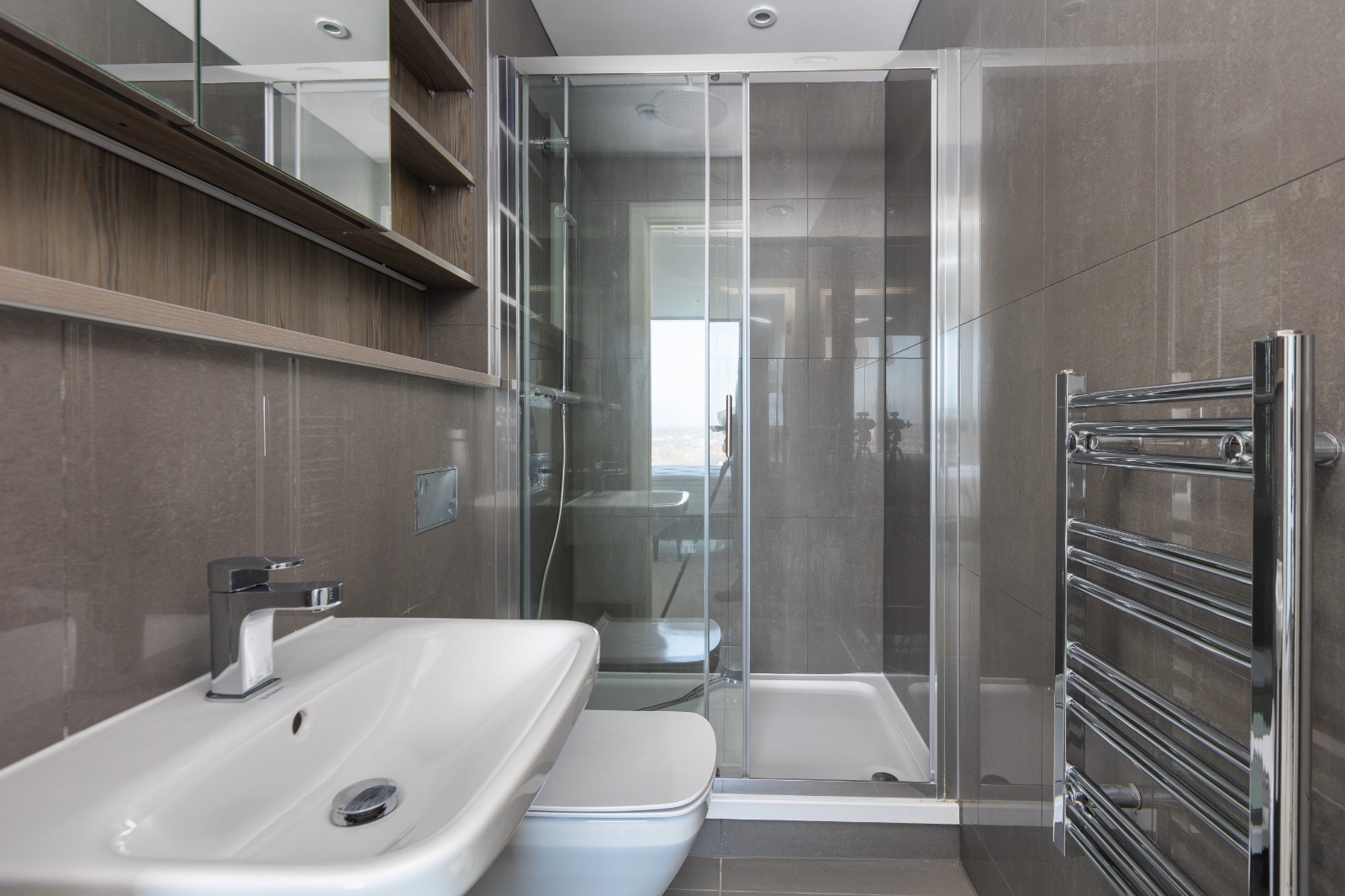 Stylish bathroom features designer fixtures and fittings including a high-pressure overhead shower as standard.