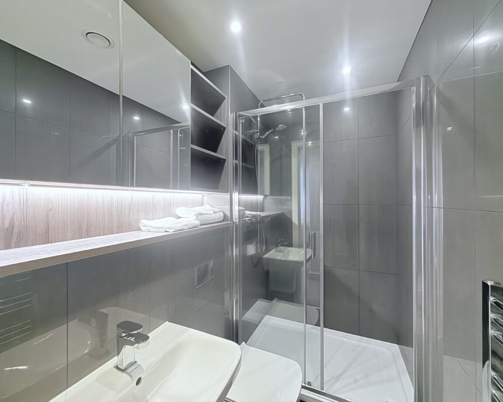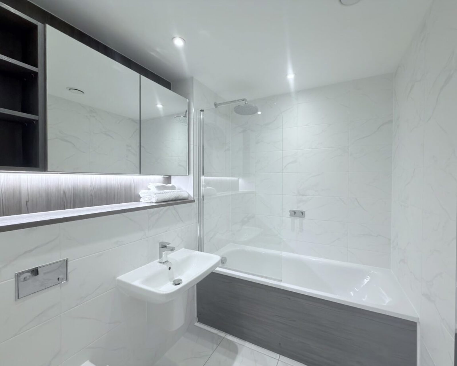 Stylish bathroom features designer fixtures and fittings including a high-pressure overhead shower as standard.