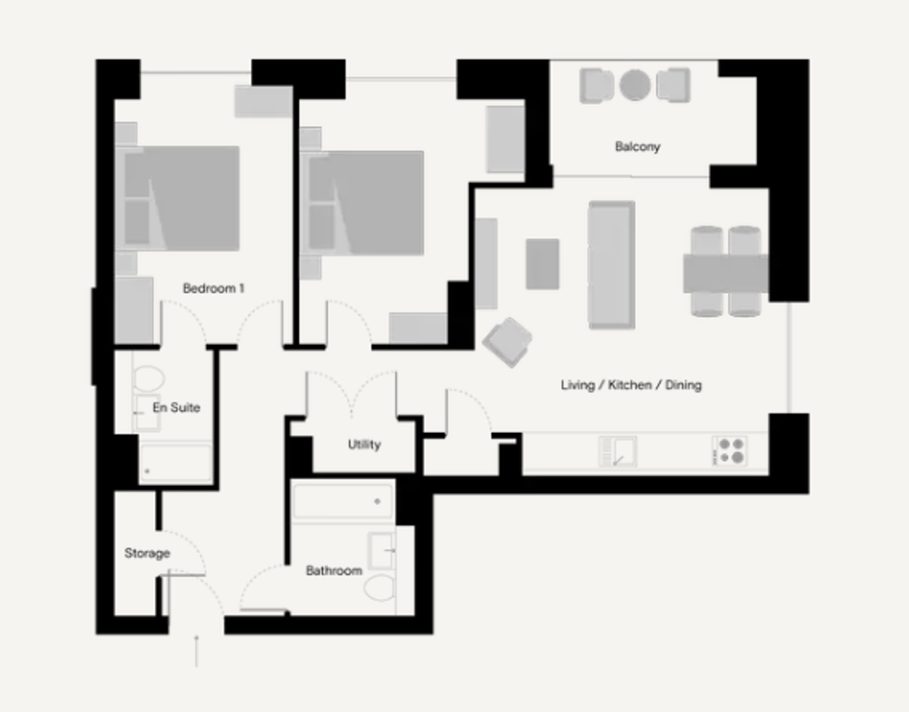 Naturally bright, floor to ceiling windows and a spacious, open-plan living area with a fully-equipped kitchen with modern appliances and private balcony.