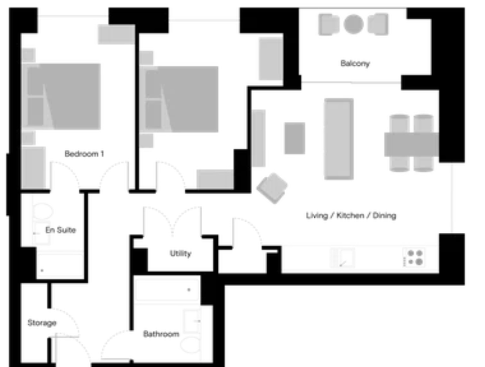 Naturally bright, floor to ceiling windows and a spacious, open-plan living area with a fully-equipped kitchen with modern appliances and private balcony.